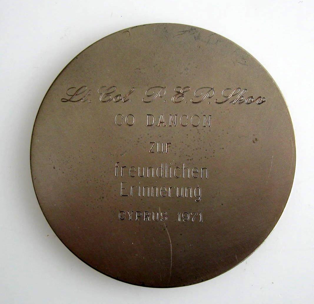 UN-Medaille - Vereinte Nationen Zivilpolizei - UNICYP. Österreichisches Kontingent. Dia:. 7,5 cm. Metall mit Emaille. Mit der Aufschrift:. Lt. Col. PEP Skov CO DANCON zur freundlichen Erinnerung, Zypern 1971. In origniales Etui. Provenienz: Oberstleutnant Poul Ervin O. Skov, Kommandant Dancon XIV, Zypern.Bestellnummer: 5425
