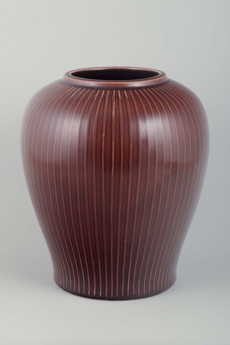 Organisk formet vase i fajance med reliefdekoreret overflade og dyb burgundy glasur med lodrette riller, som fremhæver formen.