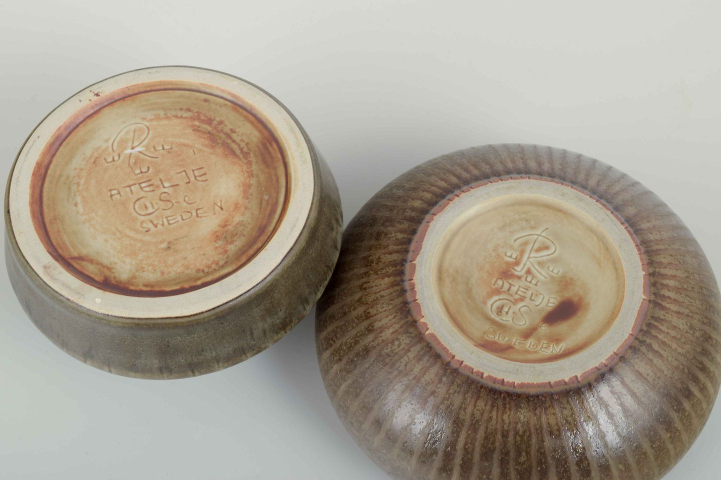To stykker stentøj bestående af en lav, rund skål og en bredformet vase med riflet dekoration. Begge med brunlig glasur i nuancer af grå, beige og brun samt indvendig dyb glasur i rødbrune toner.