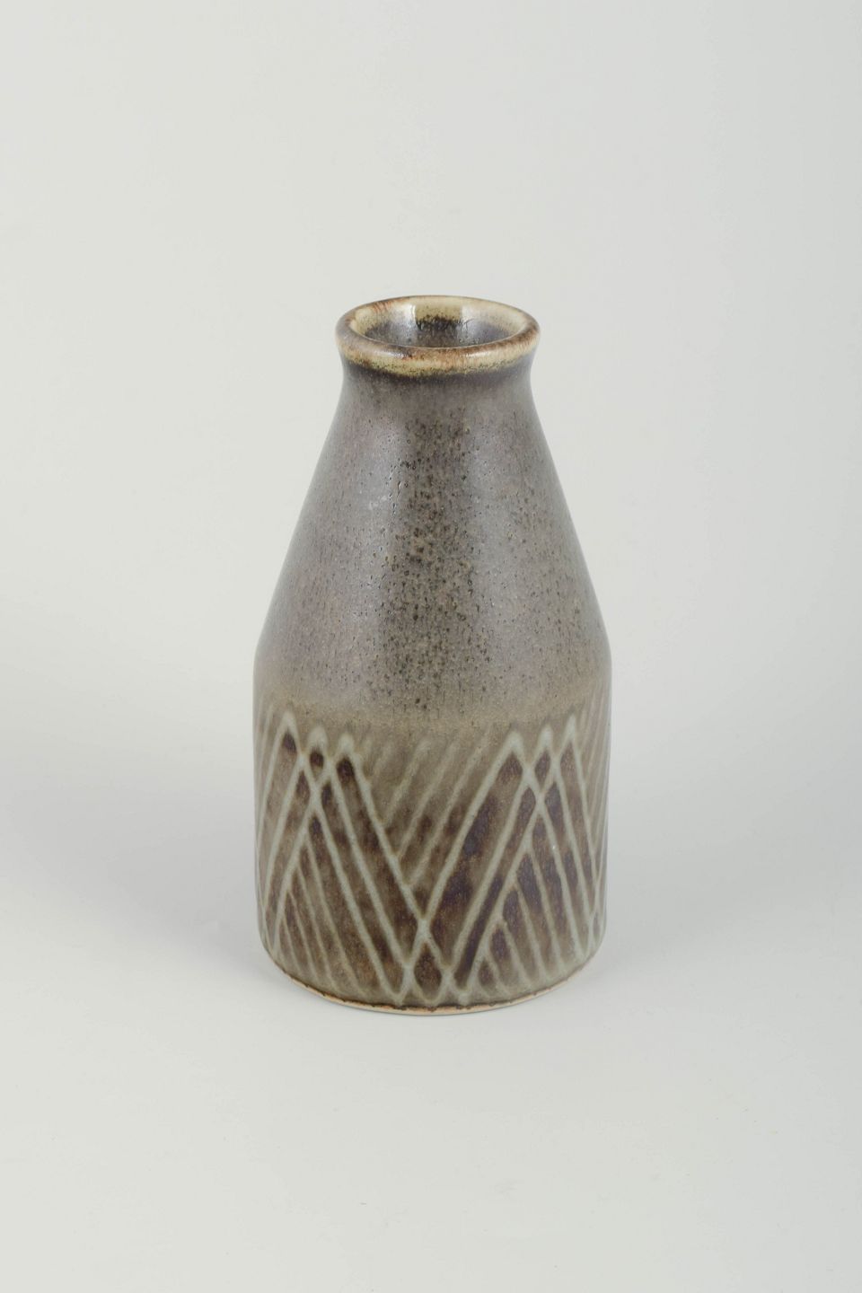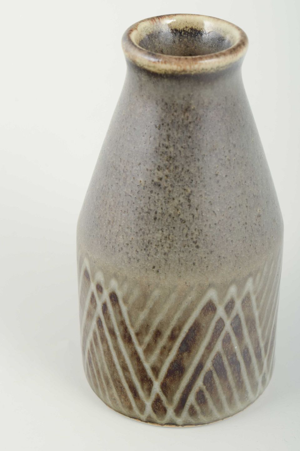 Cylindrisk formet vase i drejet stentøj med brunlig glasur og indridset geometrisk mønster i hvid dekoration.