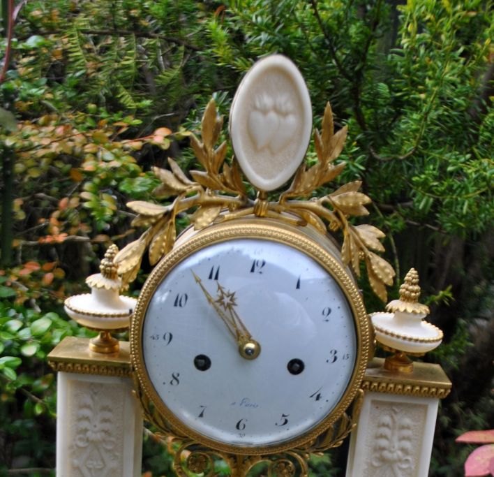 Französische Säulenuhr aus vergoldeter Bronze und weißem Marmor, Empire, ca. 1830. Säulen und Sockel mit Verzierung. Uhrengehäuse mit Blattwerk aus vergoldeter Bronze verziert. Marmorplatte mit zwei brennenden Herzen. Standarduhrwerk mit Glocke. Zifferblatt aus weißem Email mit arabischen Ziffern. Mit Pendel mit Sonne. H. cm. B.: 31 cm. T.: 12 cm. : 43Bestellnummer: 28243