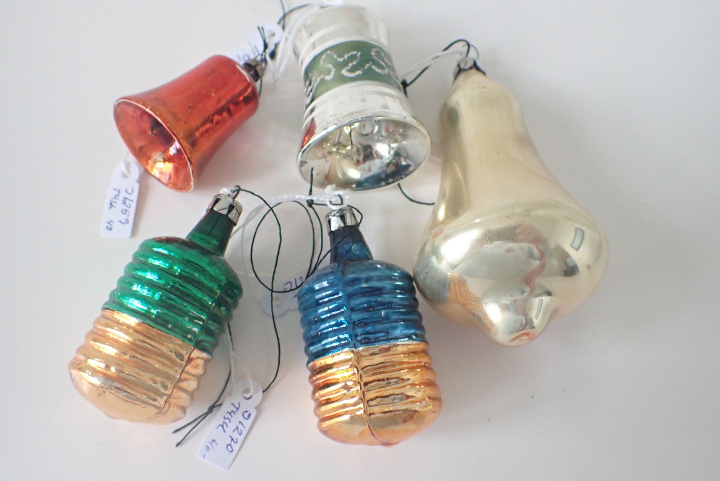 5 glasornamenter - 3 klokker i forskellige størrelse og 2 lygter.Yderst til venstre: Klokkeform i sart lyserød med hvid bemaling. Russisk. Med ophæng. Højde:10 cm. Bredeste diameter: 5 cm. I pæn stand. Pris: 175 kr.