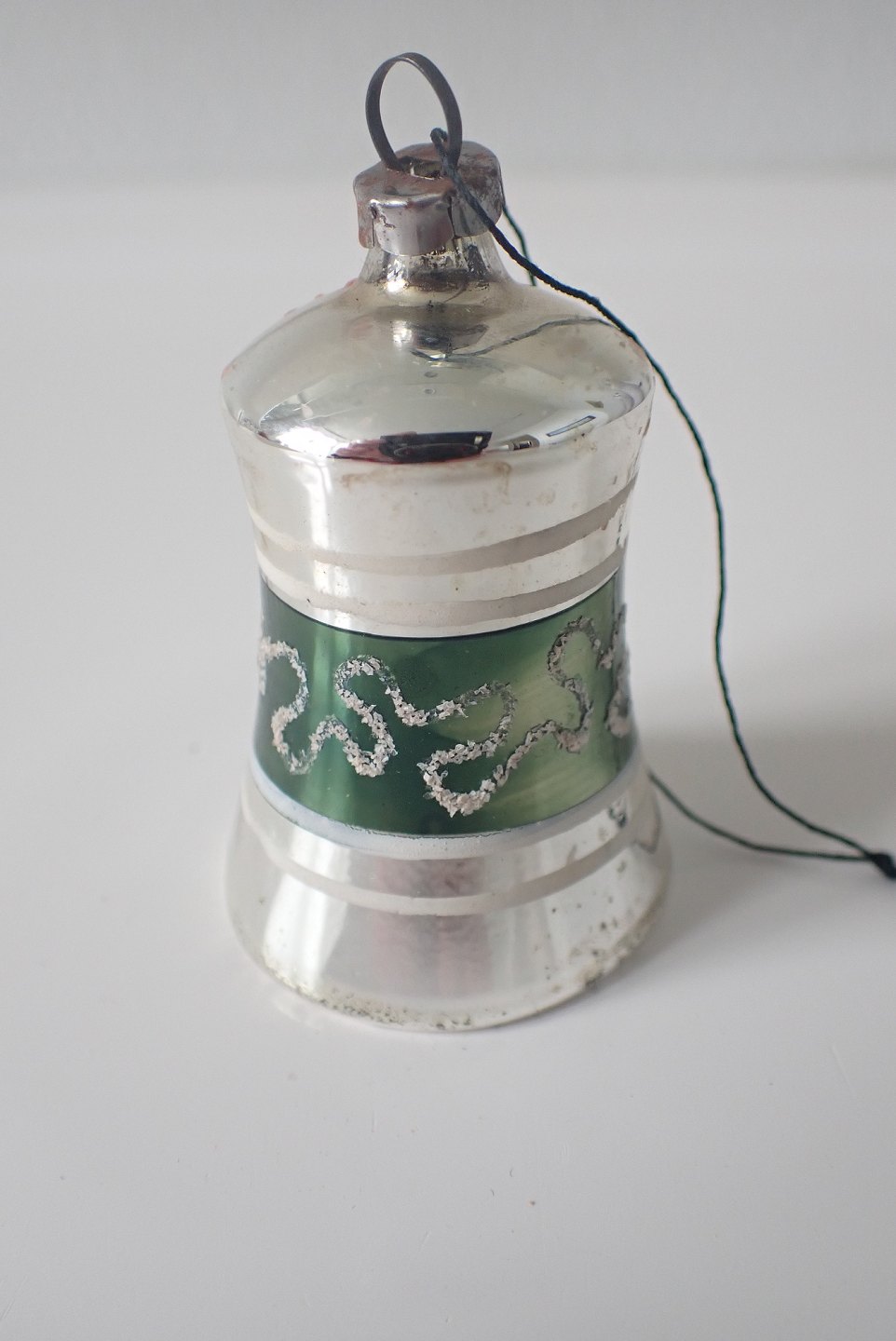 Øverst i midten: Klokke med håndmalet grøn og hvid dekoration . Højde: 5,9 cm. Tyske 1940-erne. I fin stand. Pris: 100 kr.