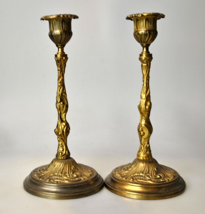 Paar französische Kerzenleuchter, 19. Jahrhundert. Mit Blumen- und Schnörkeldekor. Auf rundem Sockel. H: 20 cm. Durchmesser: 9,5 cm.Bestellnummer: 28255