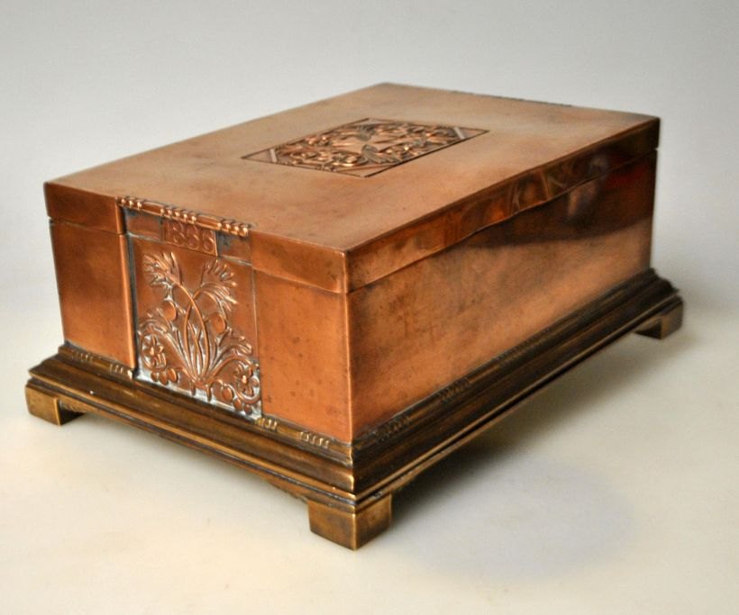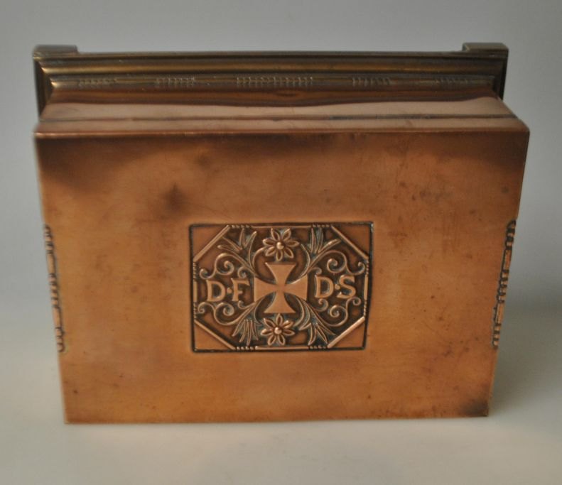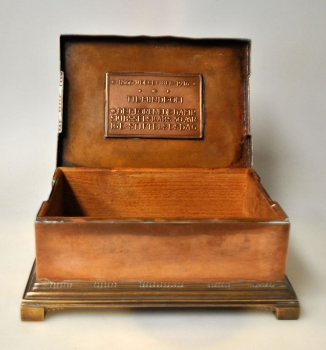 DFDS-Zigarrenkiste aus Kupfer und Messing, innen mit Holz. 1916. Johan Rohde für Georg Jensen. Geprägt mit künstlerischen Motiven und DFDS 1866-1916. Innenplakette: Zur Erinnerung an das 50-jährige Jubiläum der United Steamship Company. H. 8,5 B. 19 T. 14 cm.Weist Gebrauchsspuren in Form einiger Flecken und Kratzer auf. Die Schatulle wurde aus Kupfer, Silber und einer Kopie aus Gold für König Christian X. angefertigt.
