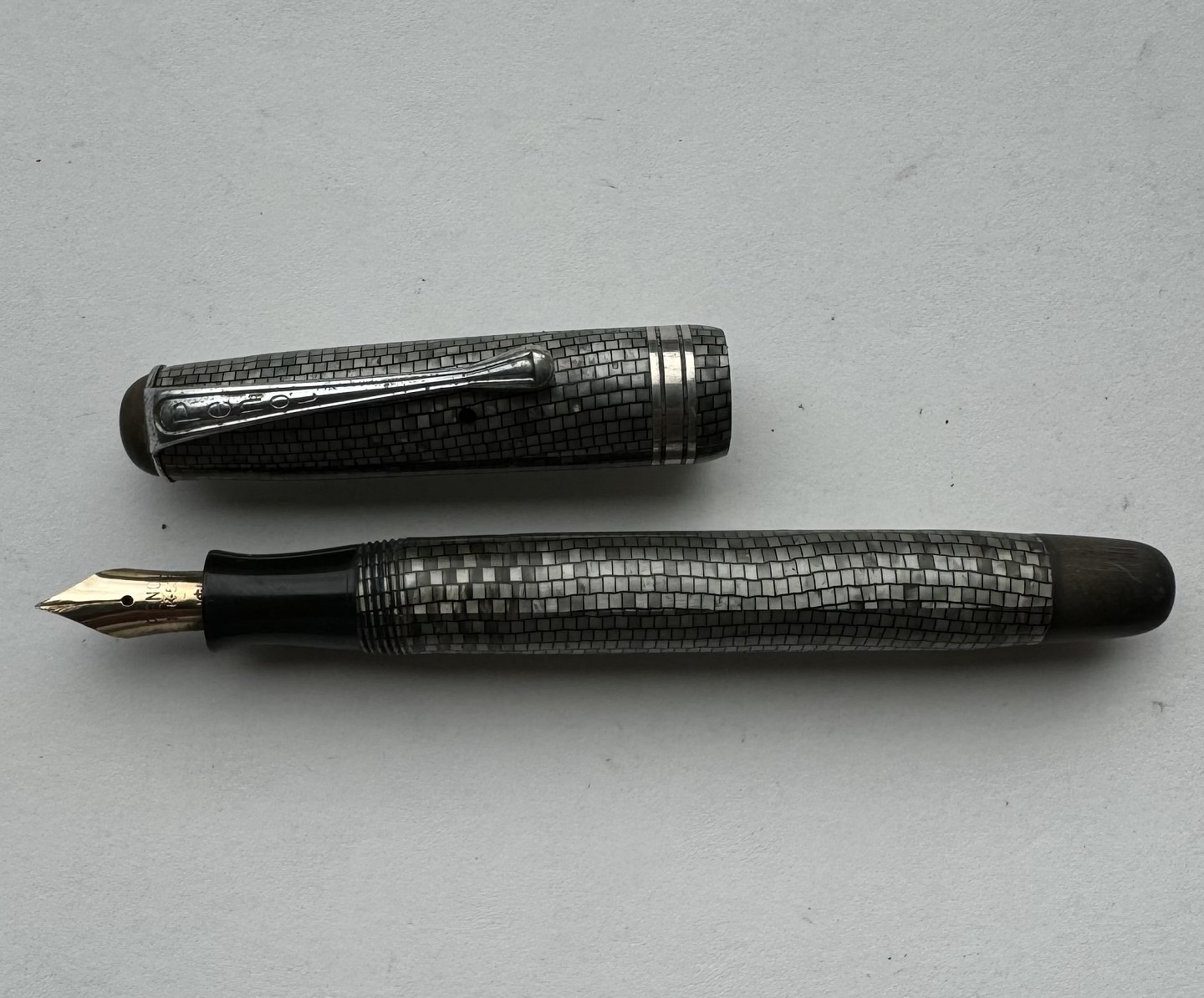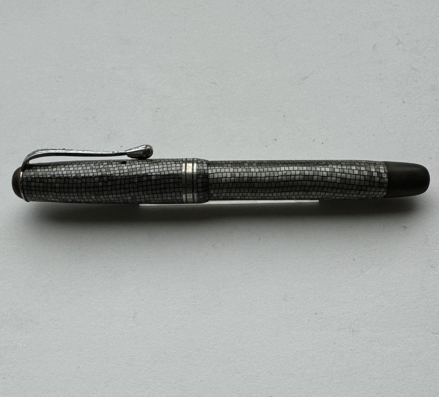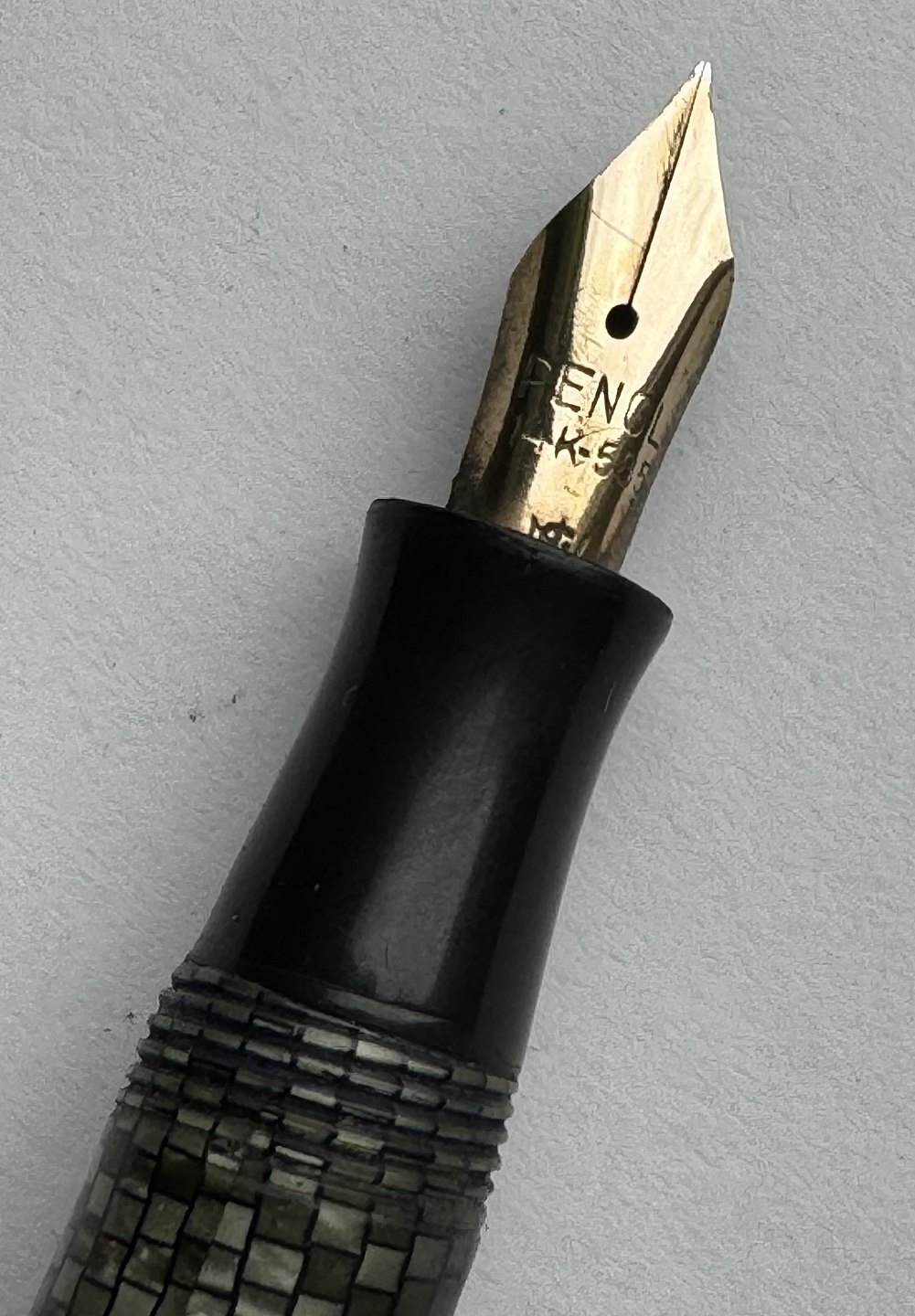 Mindre Penol fyldepen i “slangeskind” fremstillet i Danmark omkring 1940. Fremstår i god stand uden skader eller reparationer. Alle dele er originale til denne model inklusiv en 14 karat Penol guldspids. Fungerer ikke. Der skal indsættes en ny gummisæk før pennen igen kan optage blæk og skrive igen. Ny gummisæk kan indsættes mod betaling af et tillæg på kr. 250.- til købsprisen. Mål: 11,2 cm.