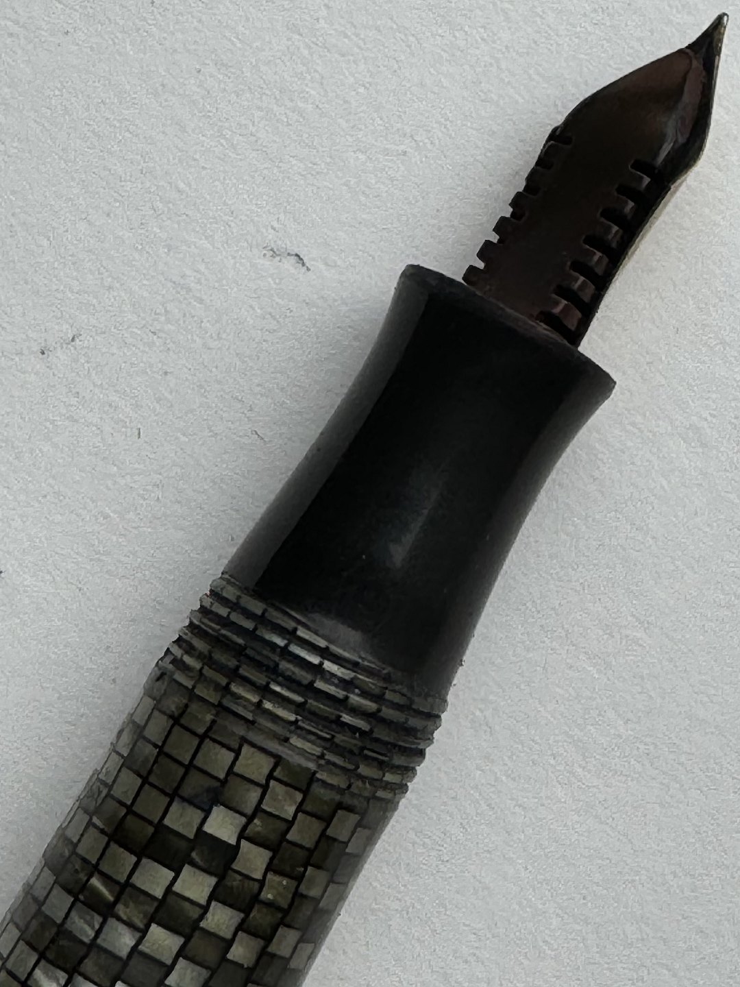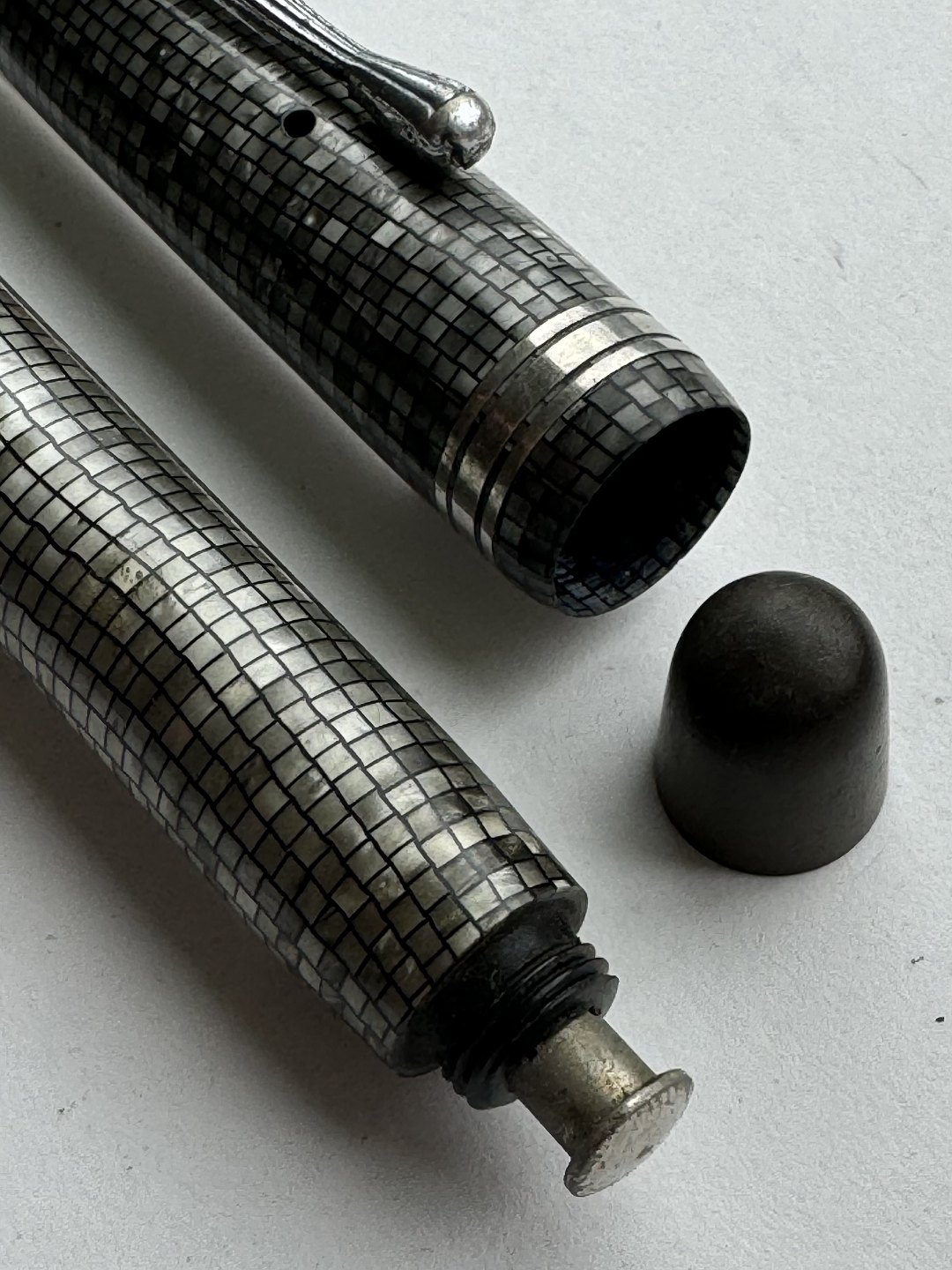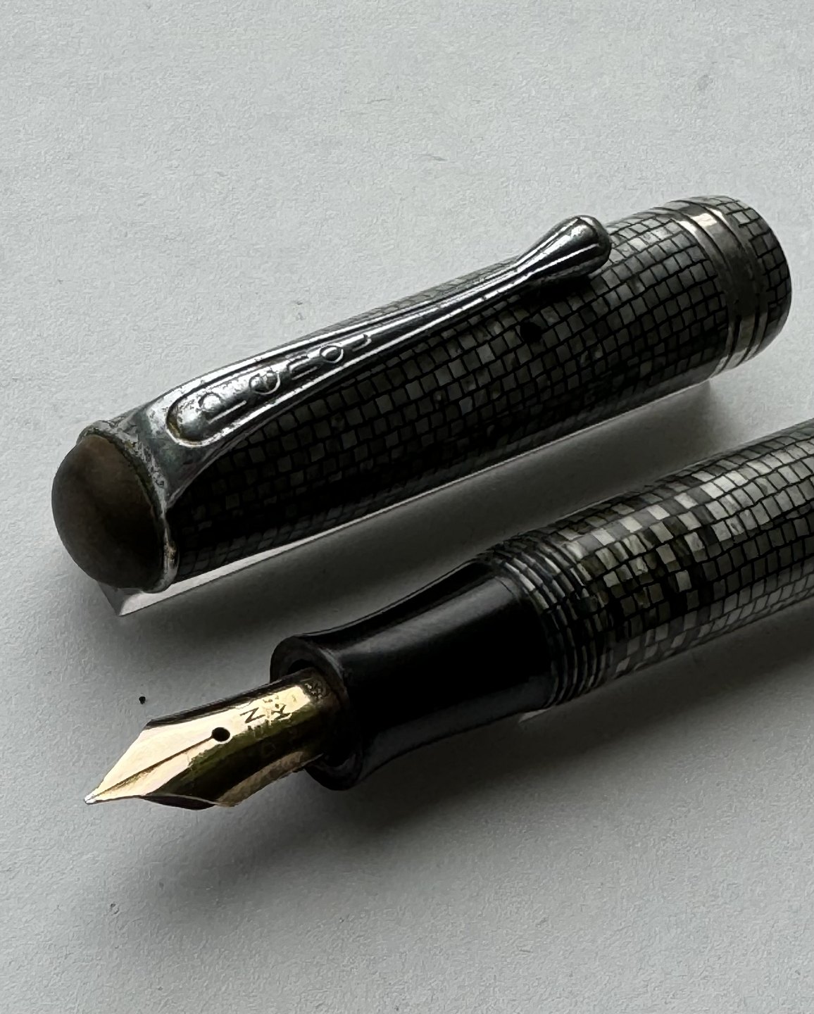 Mindre Penol fyldepen i “slangeskind” fremstillet i Danmark omkring 1940. Fremstår i god stand uden skader eller reparationer. Alle dele er originale til denne model inklusiv en 14 karat Penol guldspids. Fungerer ikke. Der skal indsættes en ny gummisæk før pennen igen kan optage blæk og skrive igen. Ny gummisæk kan indsættes mod betaling af et tillæg på kr. 250.- til købsprisen. Mål: 11,2 cm.