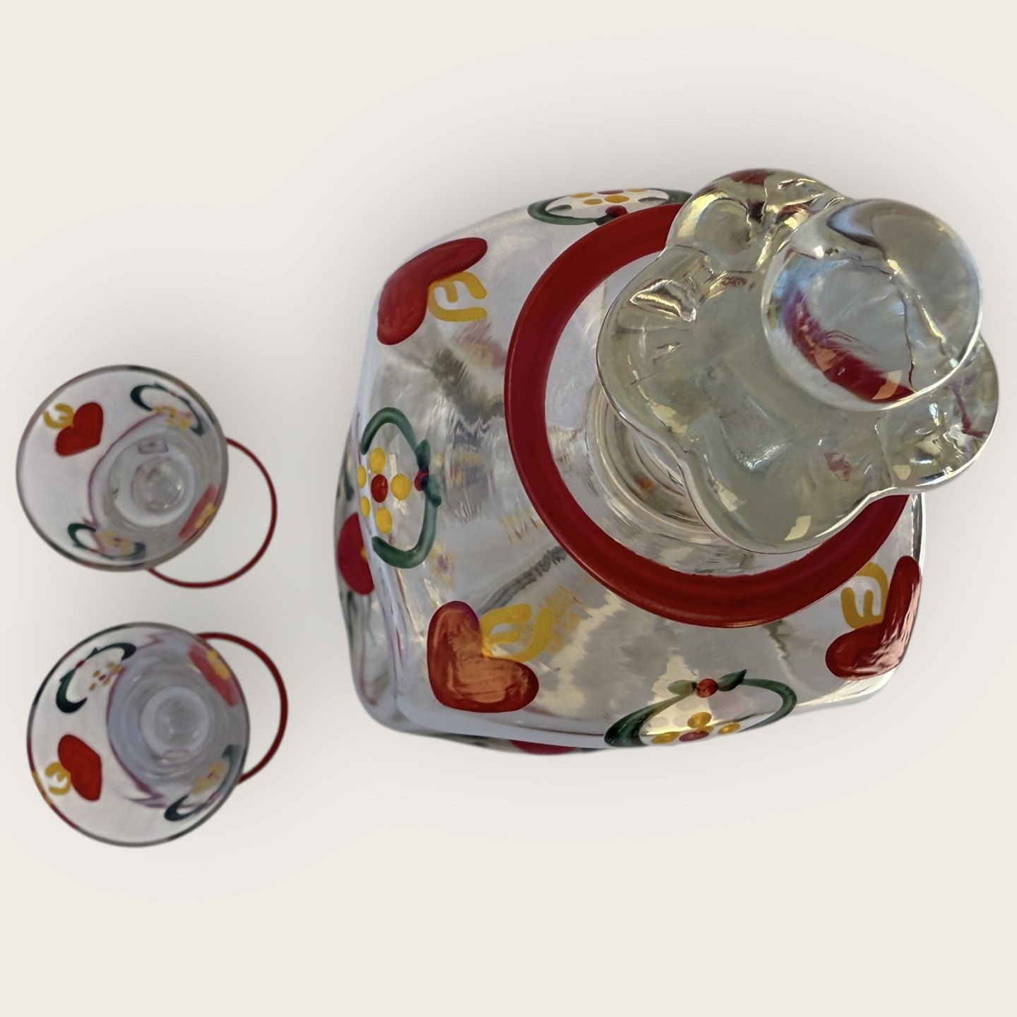 Holmegaard, Bemalte Klukflasche mit Kronkorken und 2 Gläsern, verziert mit roten Herzen etc.; Höhe 25cm, Höhe Schnapsglas 10cmLager: 1