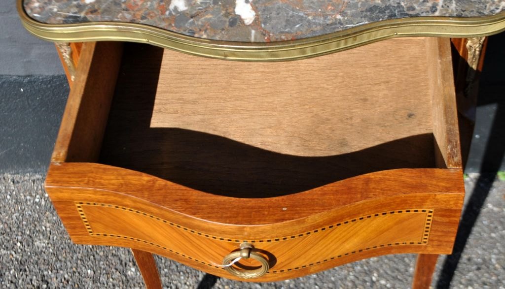 Französischer Lampentisch, 20. Jahrhundert. Mit Intarsien. Mit Messingkante und bunter Marmorplatte. Mit Bronzeschuh. H: 69 cm. B: 47 cm. T: 36 cm.Perfekter Zustand!
