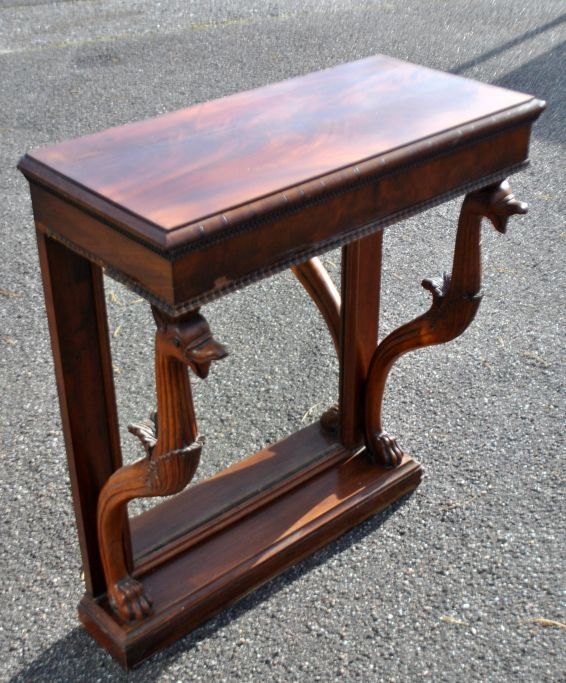 Konsole aus Mahagoni, spät Empire, ca. 1840. Dänemark. Mit Säulen in Form von Greifen mit Löwenfüßen. Rückseite mit Spiegel. H.: 87 cm. B.: 71 cm. T.: 36 cm.Bestellnummer: 28293