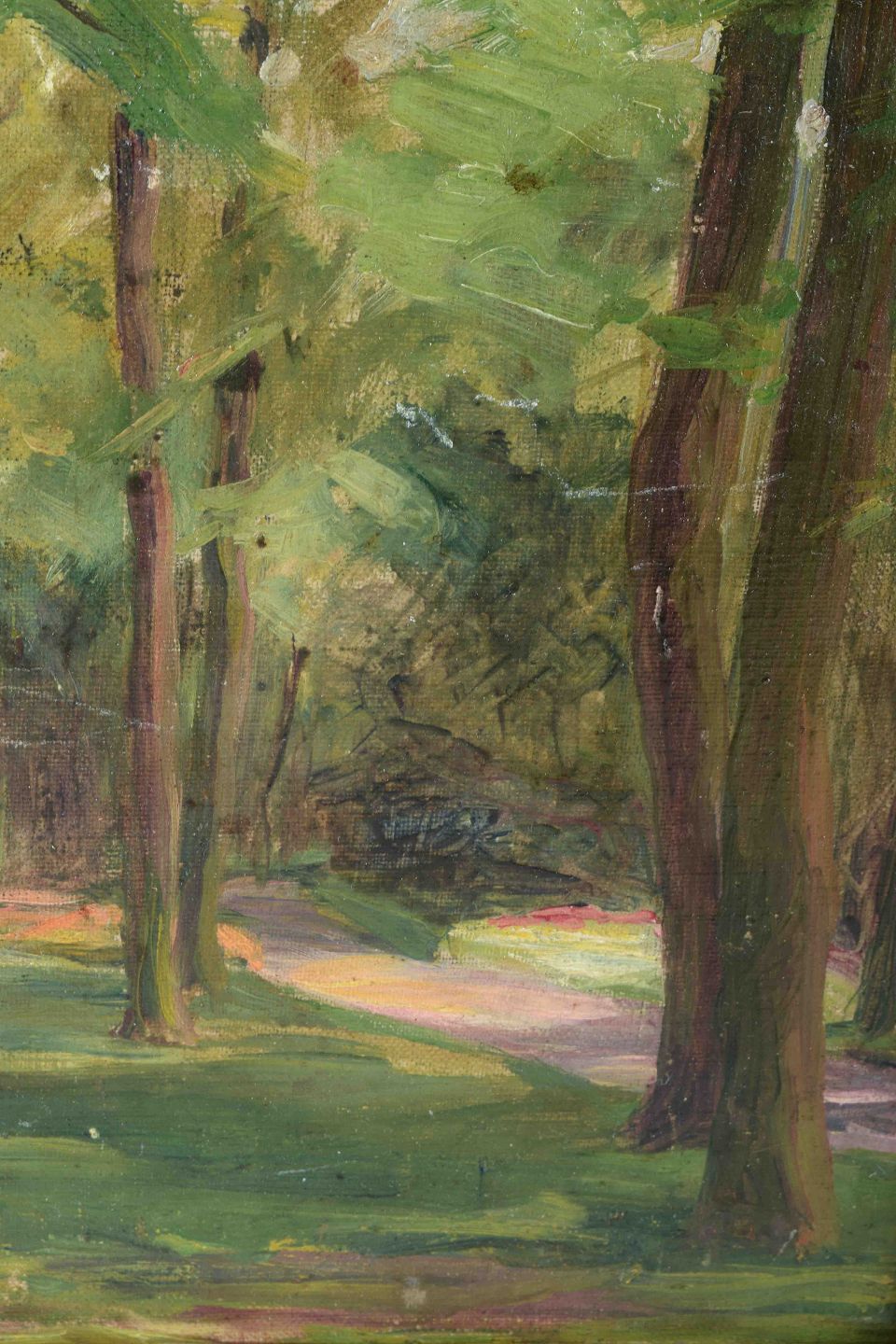 Et stemningsfuldt naturmotiv med en sti gennem en tætbevokset skov, malet i grønne og gyldne toner. Værket fanger lysets spil i løvtaget og skaber en rolig atmosfære, hvor naturens rytme træder tydeligt frem.