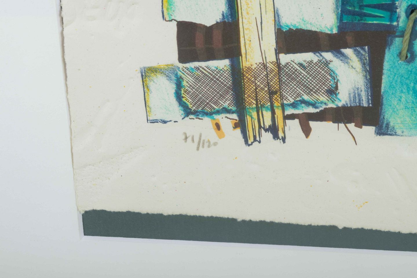 Et farverigt og dynamisk litografi, hvor geometriske og organiske former sammensættes i et patchwork-lignende mønster. De blå, grønne og jordfarvede toner skaber en rytmisk og teksturel helhed, hvor elementer som blade, vævede strukturer og dekorative linjer flettes ind i hinanden. Værket bærer præg af Soucasses interesse for balance mellem naturinspirerede symboler og en mere konstruktiv, abstrakt billedopbygning.