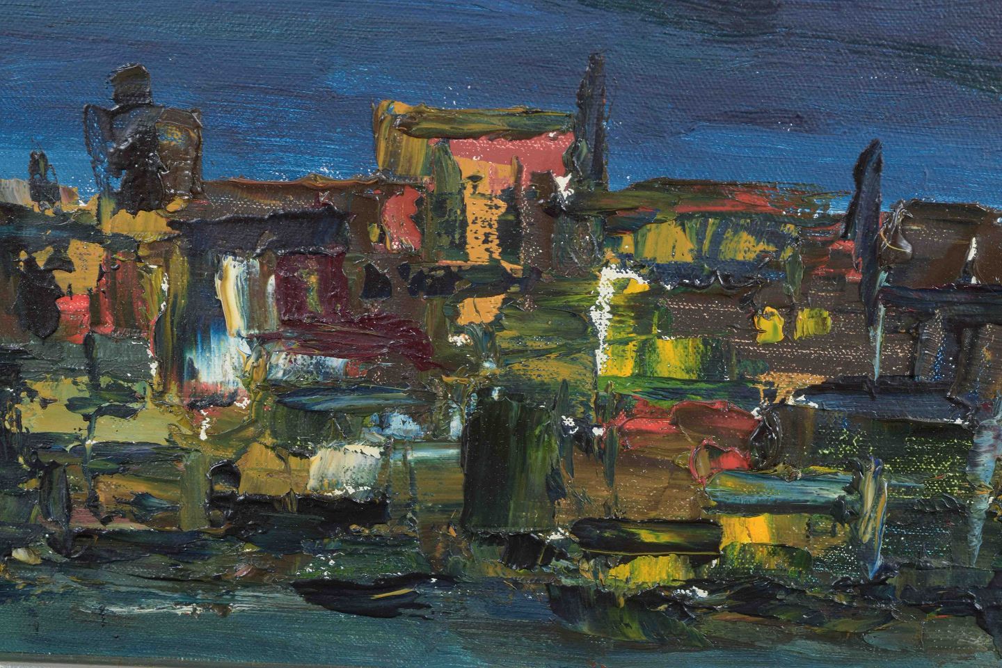 Et ekspressivt nattebymotiv med måne og byens lys under en mørk himmel, skildret med kraftige penselstrøg og intens farvebrug.