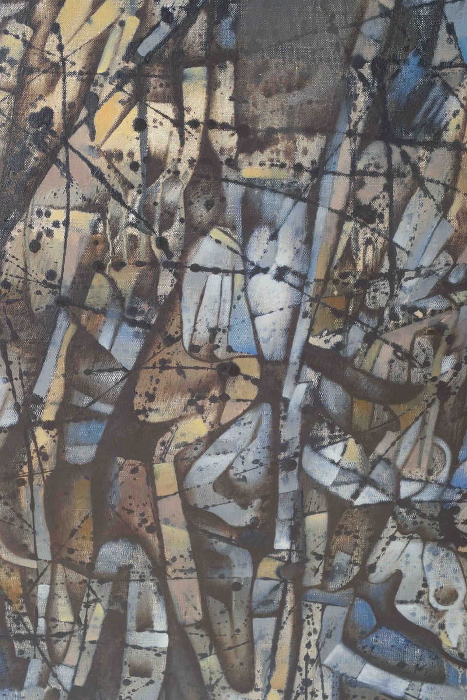 Et ekspressivt og komplekst abstrakt maleri, hvor figurlige og organiske former flettes ind i et rytmisk netværk af linjer og farvefelter i blå, brune og gyldne nuancer. Værket bærer præg af Lacomblez’ særlige surrealistisk-abstrakte billedsprog og hans optagethed af det mytologiske og det drømmende.