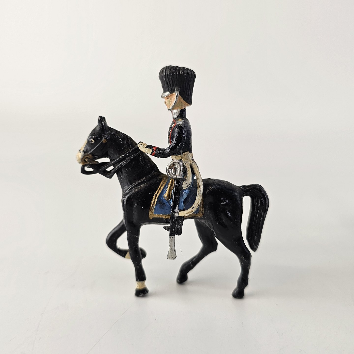 17 figurer af livgarder med bjørnehuer i tin, to til hest og 15 gående med trommer, fløjter, eller våben