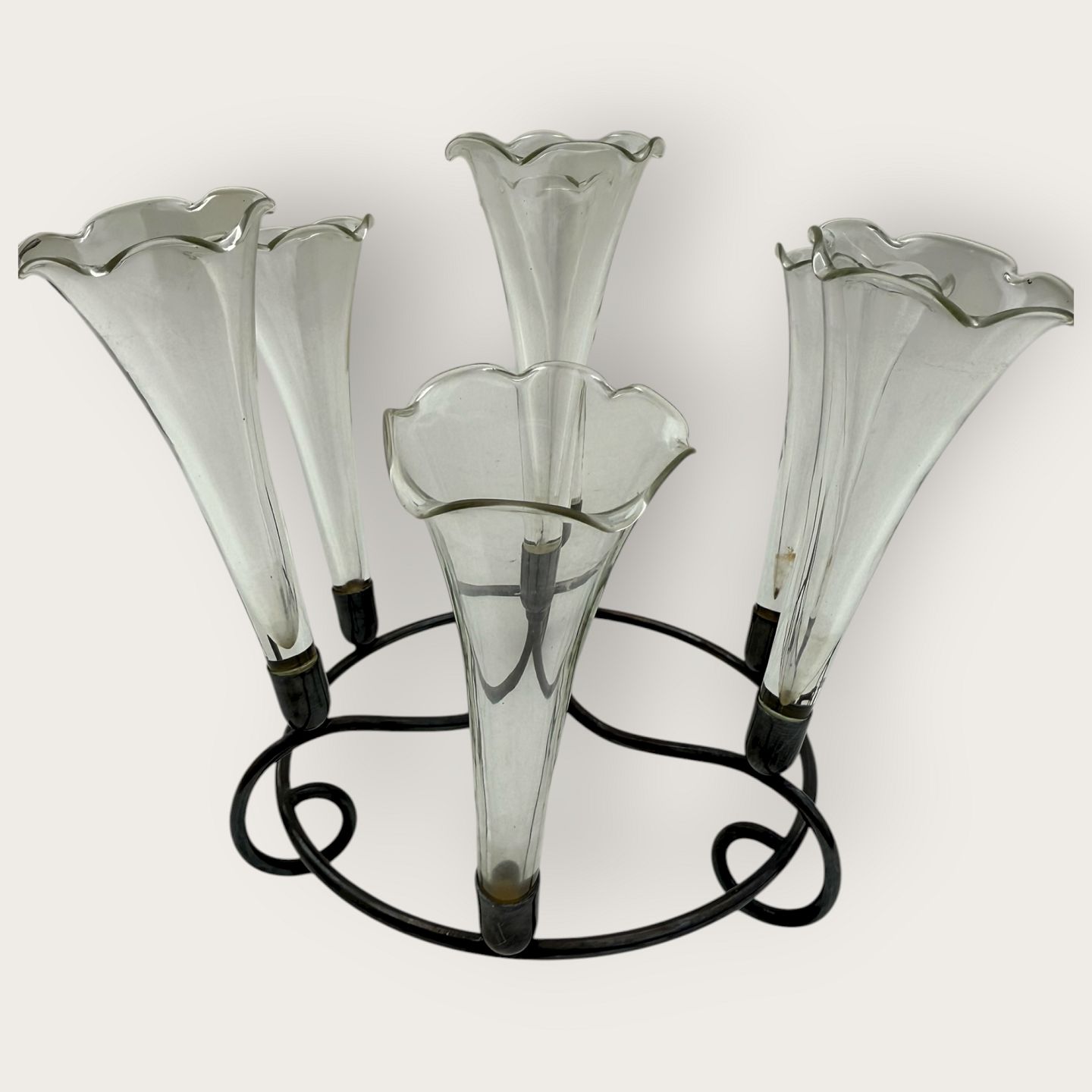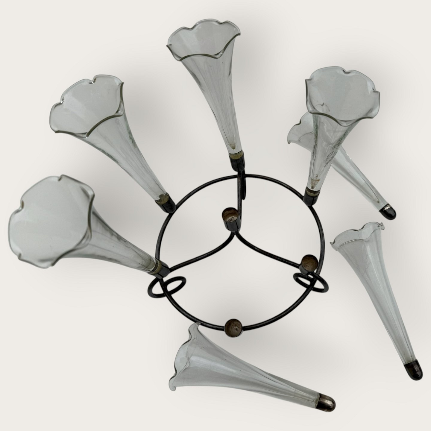 Epergne-Vase, Feines dünnes Glas mit gerüschtem Rand, alle Vasen mit versilberter Montierung, 7 Vasen in Jugendstil-Halterung, ca. 19cm hoch und 24cm im Durchmesser, jede Glasvase 13x5cm *Guter Zustand*Lager: 1