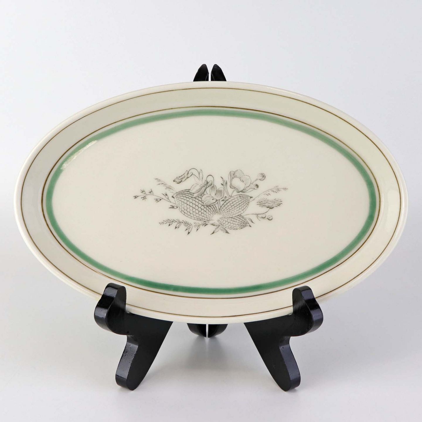Service i glat cremefarvet porcelæn med grøn og sort kantstreg samt dekoration af blomster og grene i sort streg.