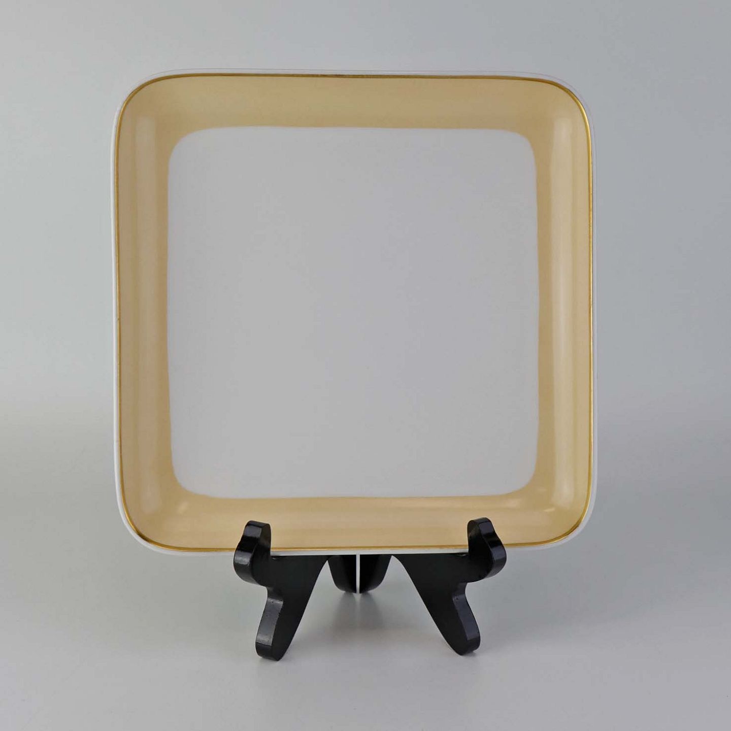 Service i glat hvid porcelæn med sandfarvet dekoration og gylden kant.