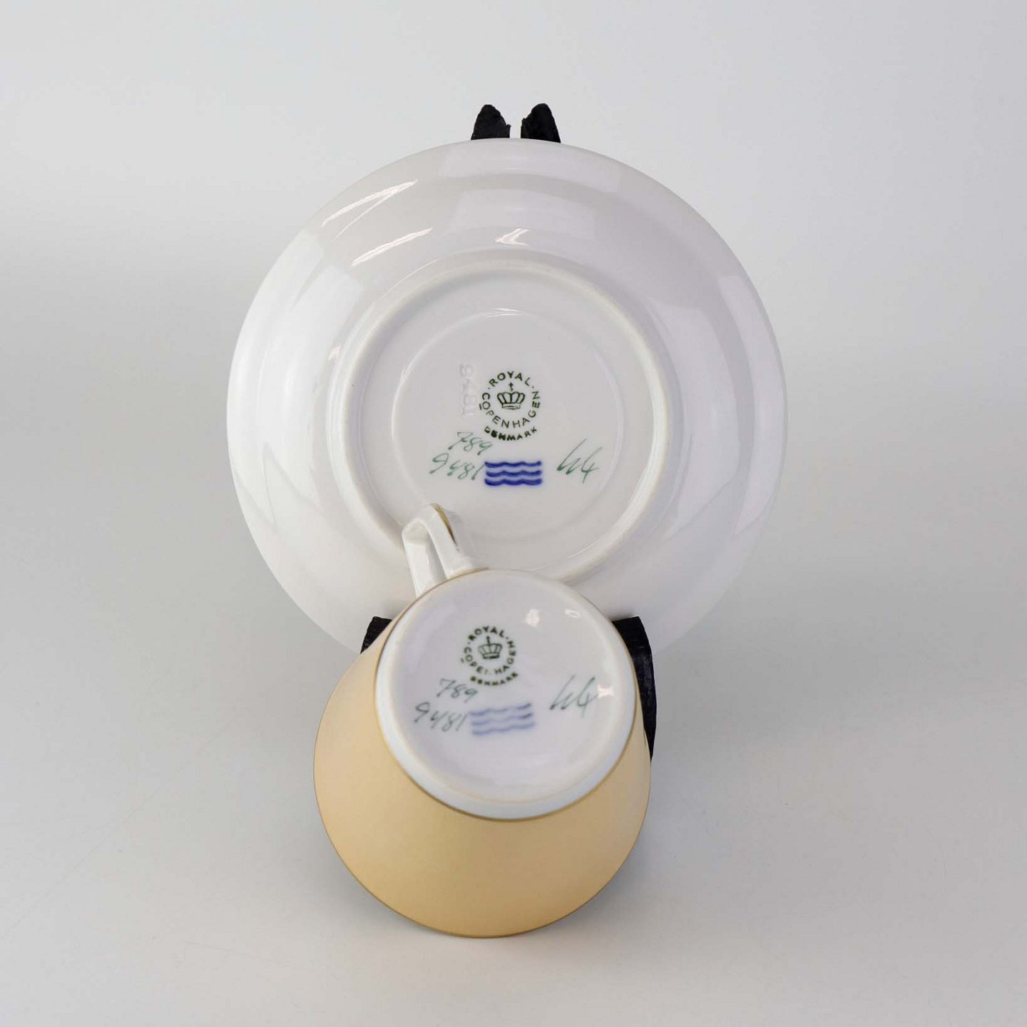 Service i glat hvid porcelæn med sandfarvet dekoration og gylden kant.