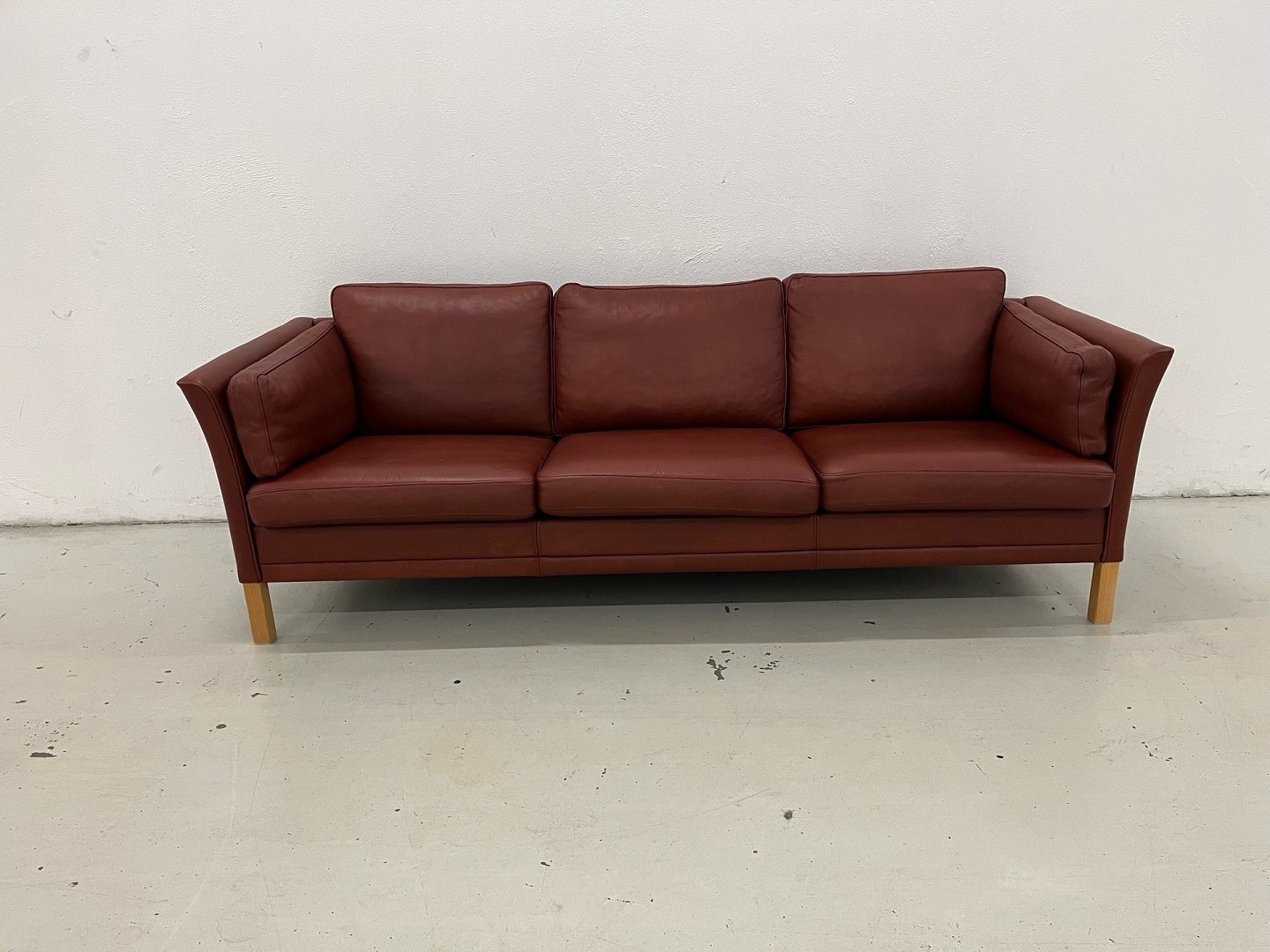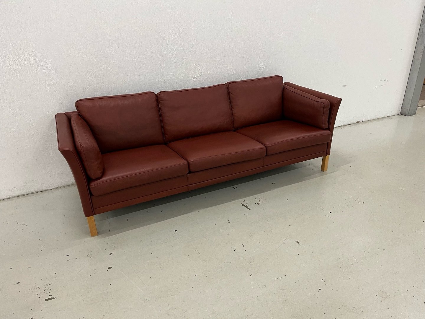 Von einem Architekten entworfenes 3-Sitzer-Sofa Mogens Hansen MH2225 in Gefion-Leder Cognac und Beinen 40-40 in Buche. Neupreis: 42.339,-. Das Sofa hatte 1 Besitzer, wurde kaum benutzt und ist in wirklich tollem Zustand. Das Sofa ist in einem super Zustand und wurde wenig benutzt. MH 2225, 1971 auf den Markt gebracht, ist noch immer eines der beliebtesten Londoner Sofas von Mogens Hansen. Die leicht geschwungene Armlehne, die einfachen und klaren Linien und die relativ geringe Sitztiefe bieten einen einzigartigen Sitzkomfort, wodurch das Modell auch heute noch seine offensichtliche Berechtigung im Sortiment von Mogens Hansen hat. Schönes und klassisches Sofa von Mogens Hansen. Ausgestattet mit Daunen-Sitzeinsätzen und Rückenkissen mit Polydaunen, die genau den richtigen Komfort und die richtige Optik bieten. Hier können Sie den ganzen Morgen bequem sitzen und bei einer guten Tasse Kaffee lesen. Der Look ist, wie immer bei Mogens Hansen, stilvoll, einfach und minimalistisch mit einer Eleganz, die in die meiste Händler