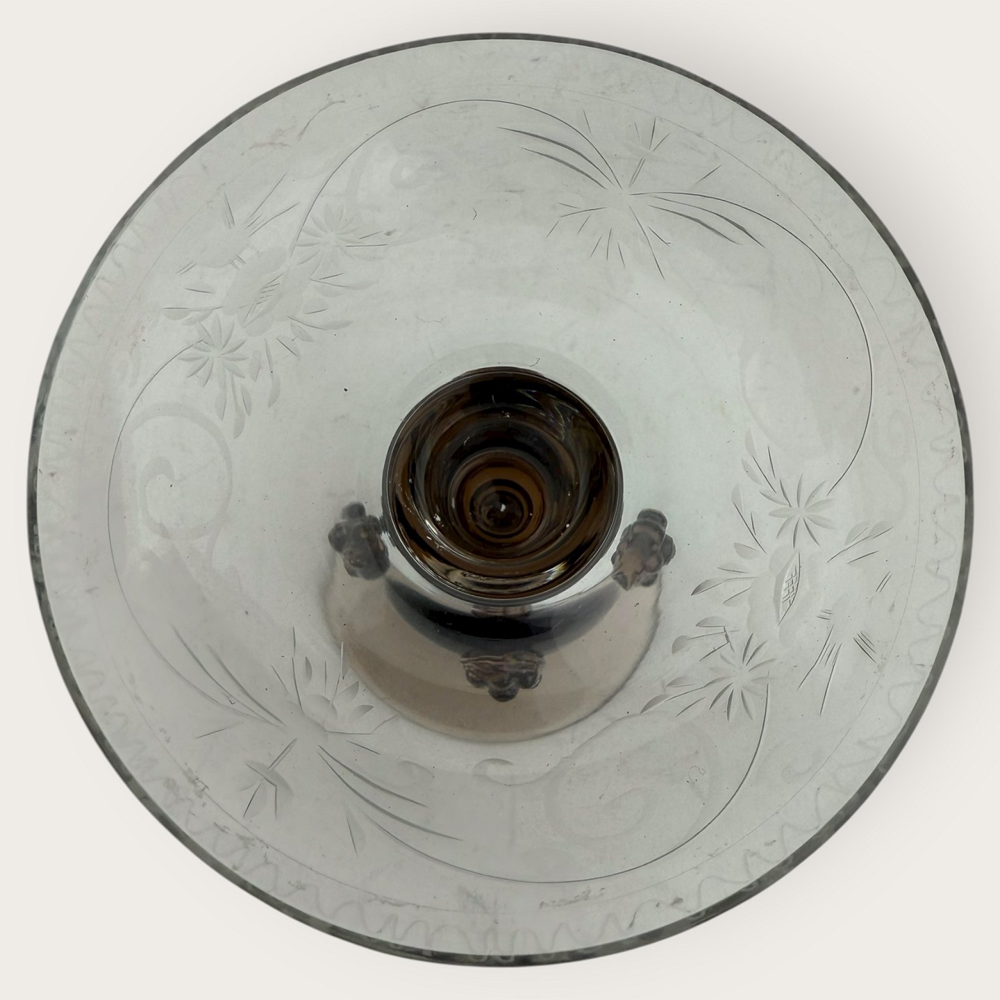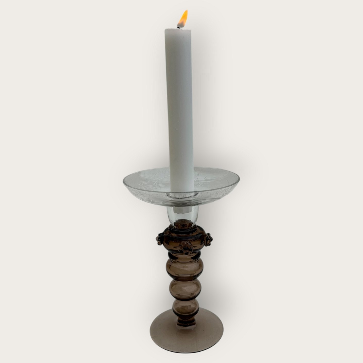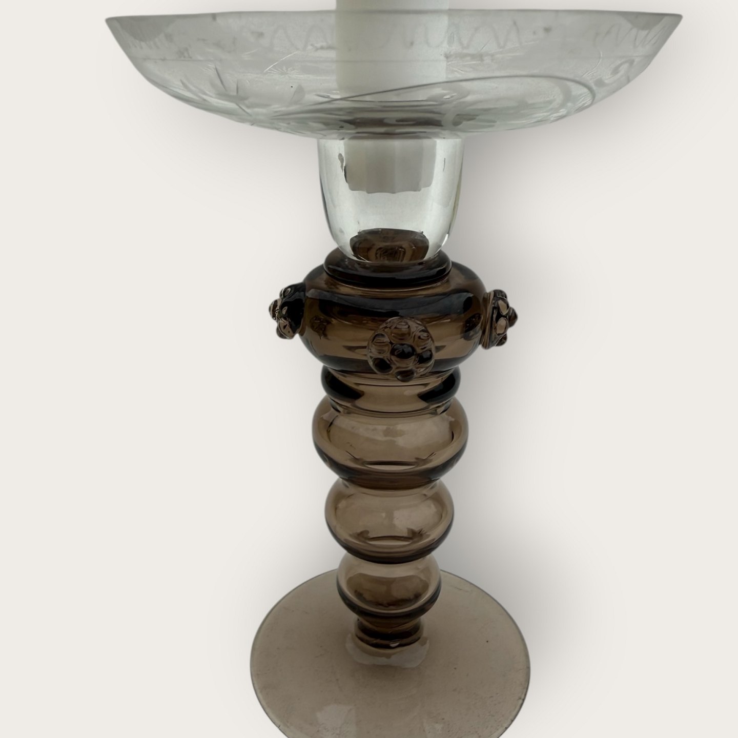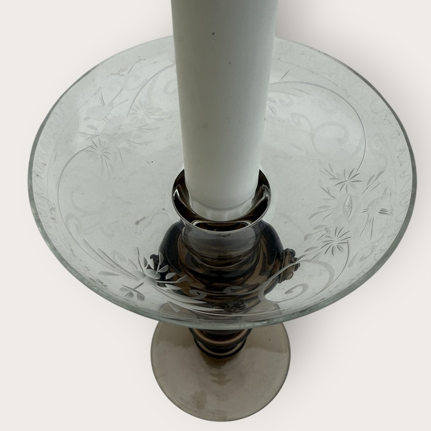 Alter Kerzenständer aus Glas, hohler brauner Stiel mit Rosetten, Schale mit Schnitten von Vögeln, Mustern und Blumen, schöner Zustand, Höhe 16,5 cm, Durchmesser 11 cmLager: 1