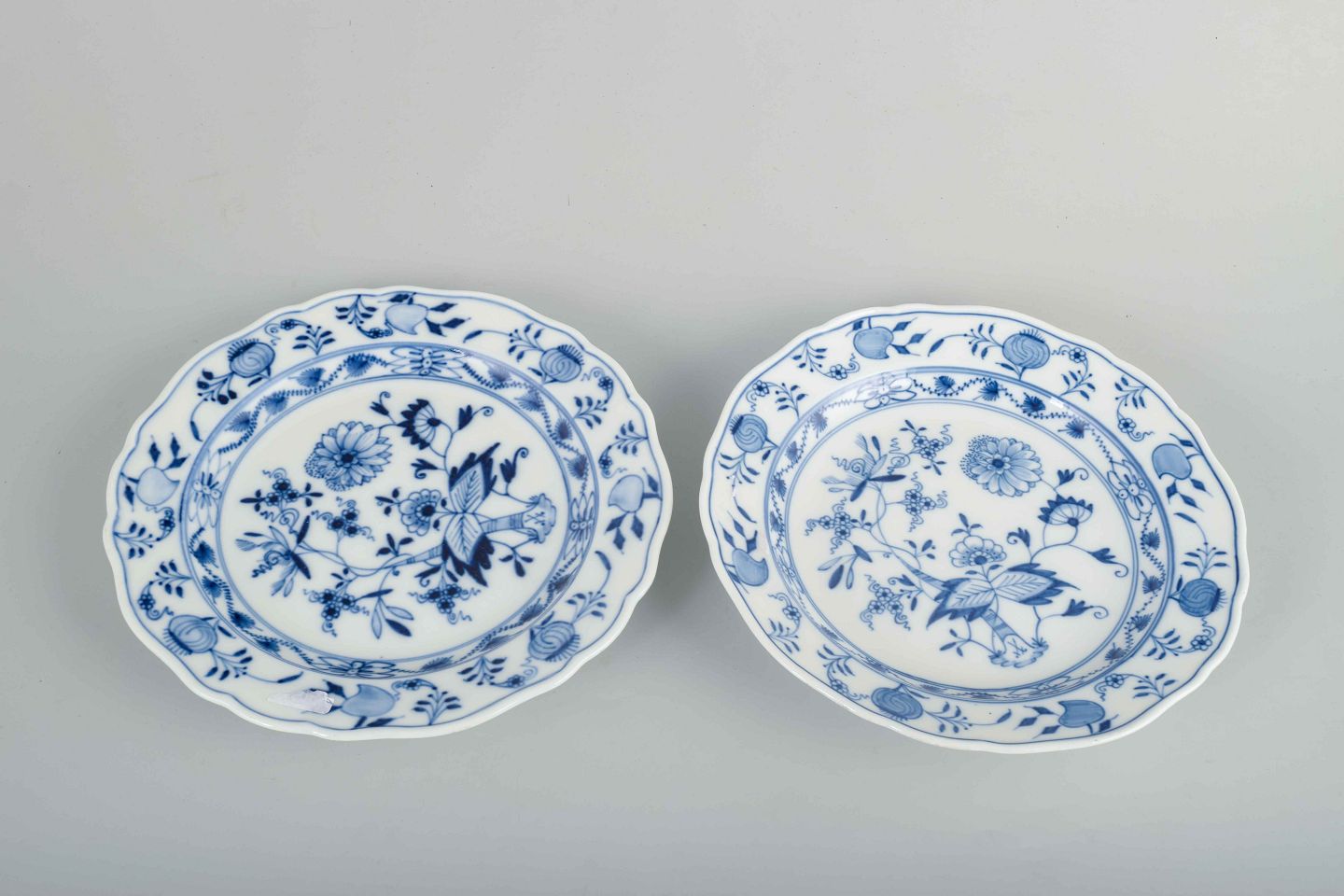 Porcelænstallerkener med den klassiske blå løg-dekoration, håndmalet i blå underglasur. Dekoreret med blomster- og løvmotiver samt bølget kant.