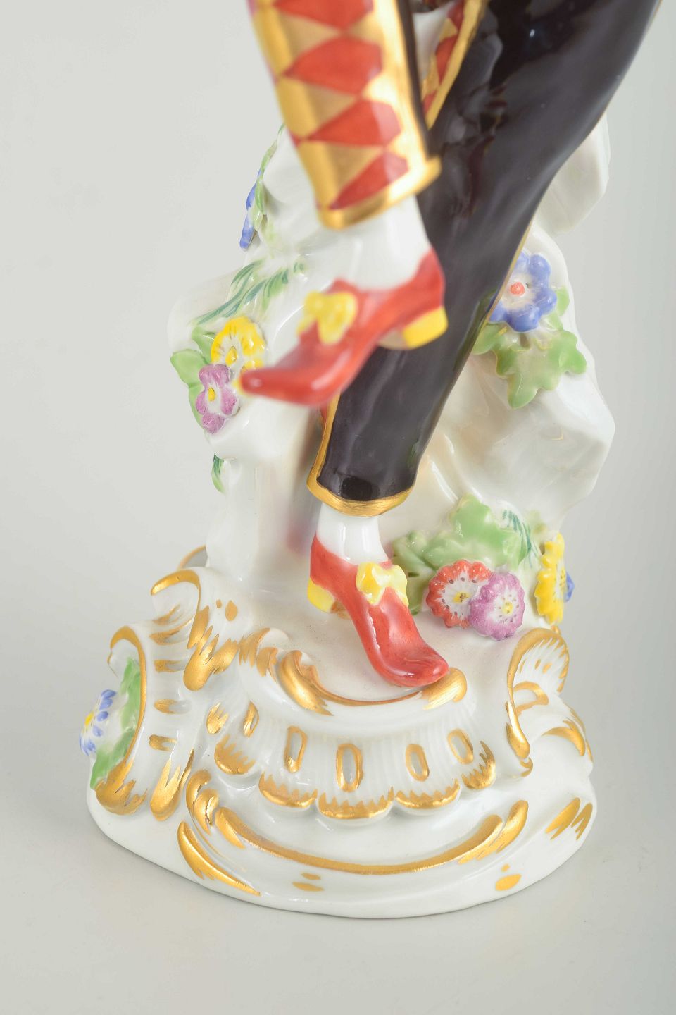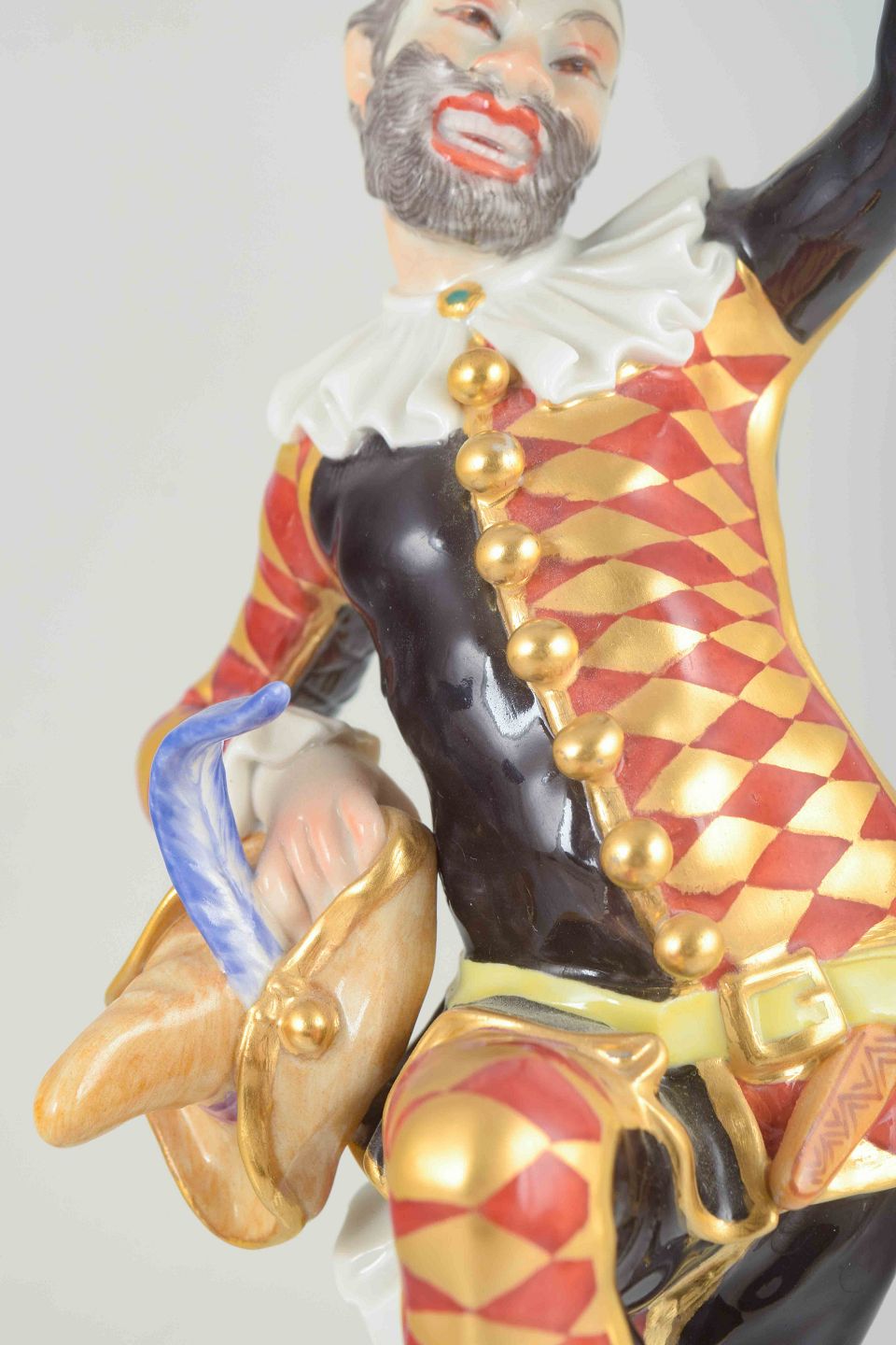 Pragtfuld og detaljerig porcelænsfigur af Harlekin i klassisk Commedia dell’arte-dragt, udført i de fineste farver med overdådig håndmalet staffering i rødt, guld og sort. Figuren skildrer Harlekin i festlig positur med løftet krus, rigt dekoreret med gulddetaljer og stående på en rokoko-inspireret base med blomster.