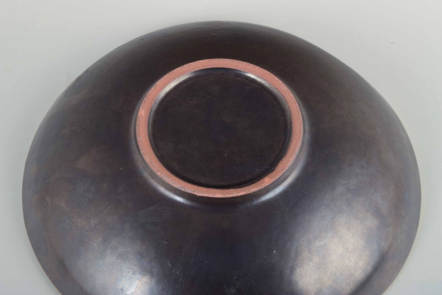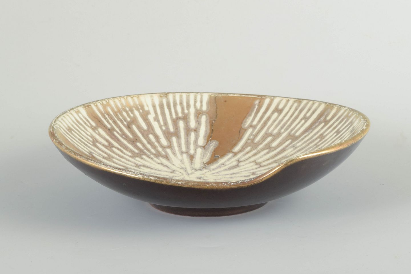 Drejet stentøjsskål med organisk form. Indvendigt dekoreret med stråleformet mønster i hvide og gyldne glasurtoner på lys brun bund. Udvendigt mørk, næsten sort glasur.