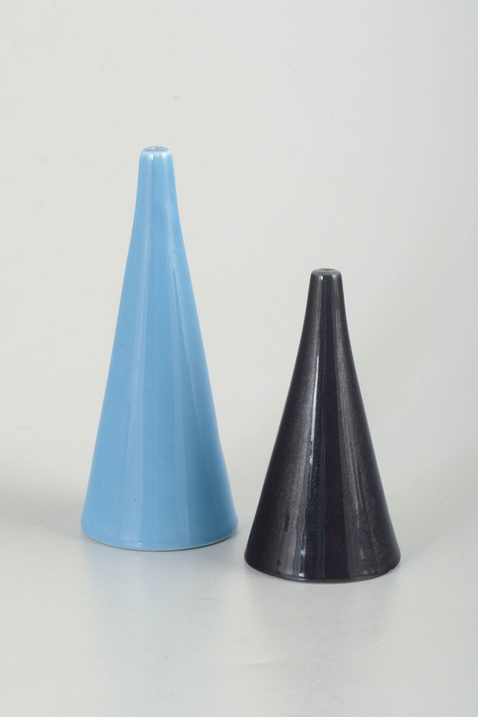 Par af kegleformede salt- og peberbøsser i glaseret fajance, i blå og sort glasur.