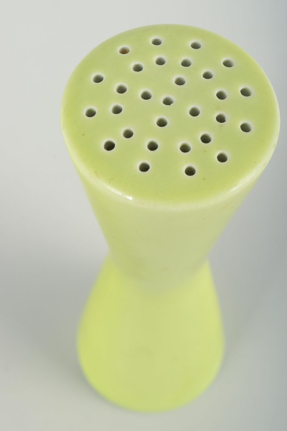 Organisk formet sukkerstrøer i glaseret stentøj med konisk, dobbelttrukket silhuet og blank limegrøn glasur.