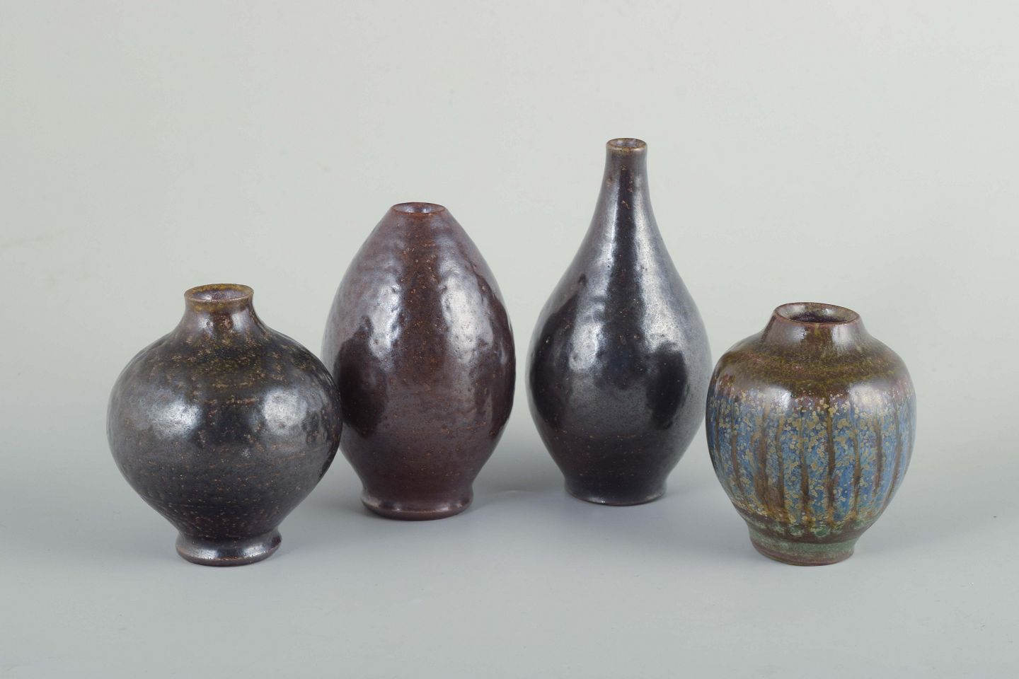 Organisk formede vaser i drejet stentøj med rå overflader og glasurer i brune, sorte og blå-grønne toner.