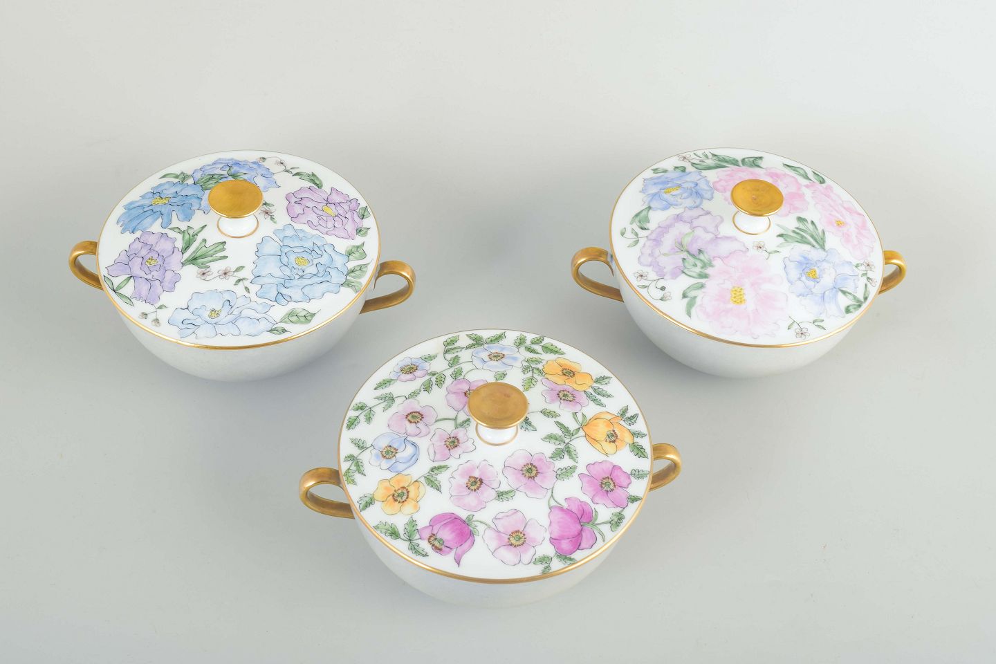 Sæt af 3 bouillonkopper i porcelæn med tilhørende låg, hånddekoreret med blomster i blå, lilla, rosa og grønne nuancer samt guldfarvede detaljer på hanke og knop.