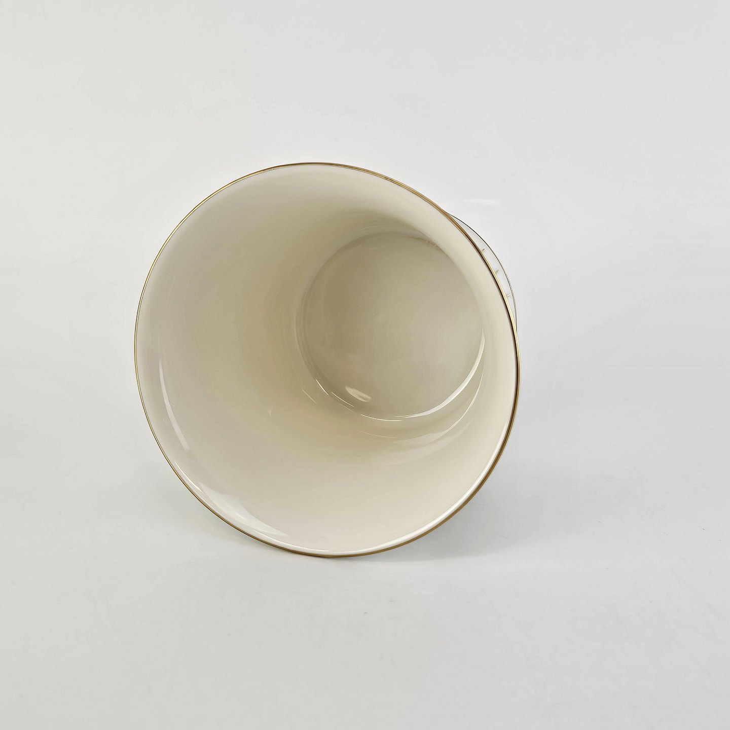 Kaktus er cremefarvet porcelæn i skælform, dekoreret med kaktusblomster og guldkant