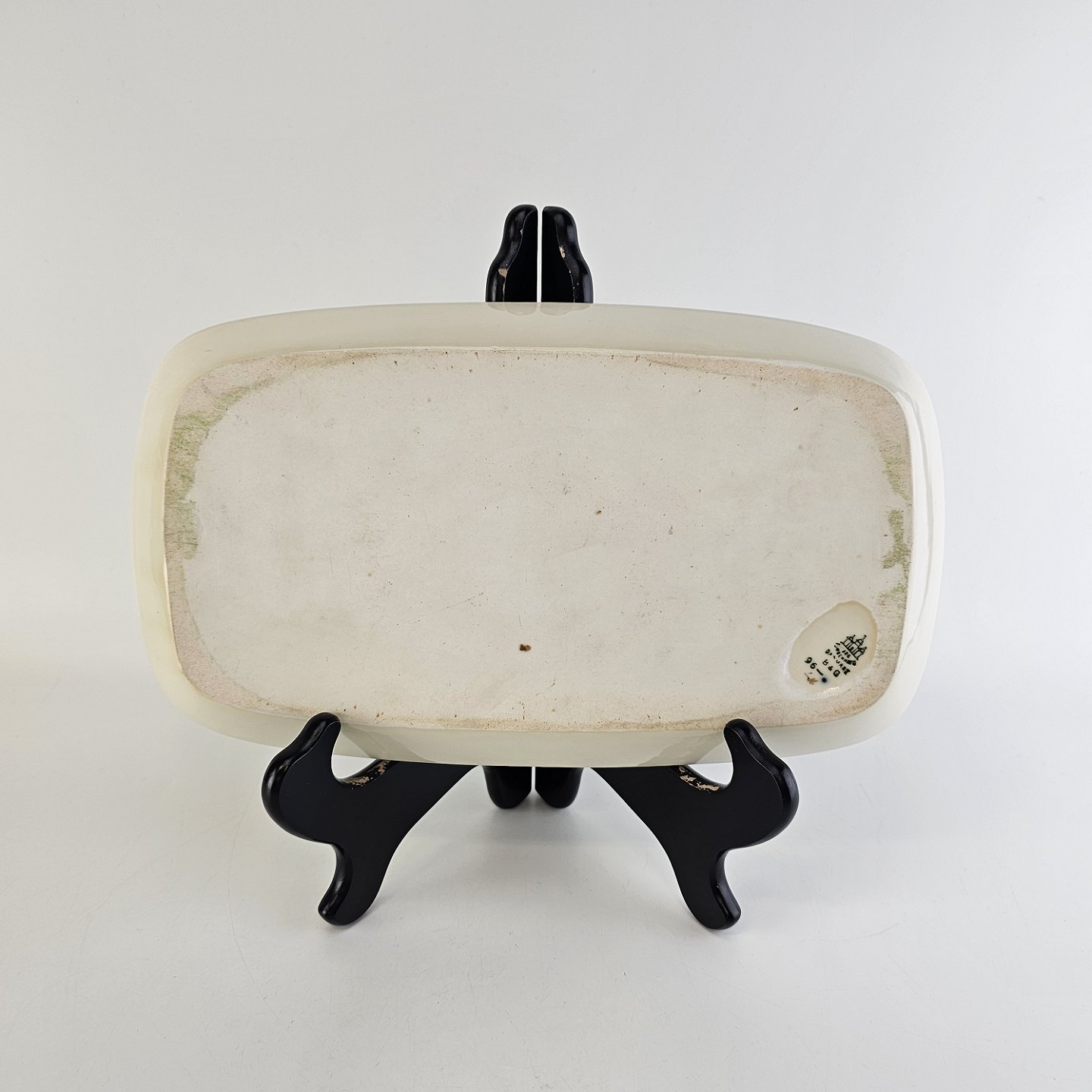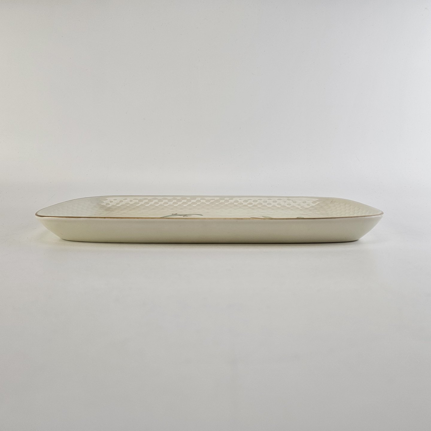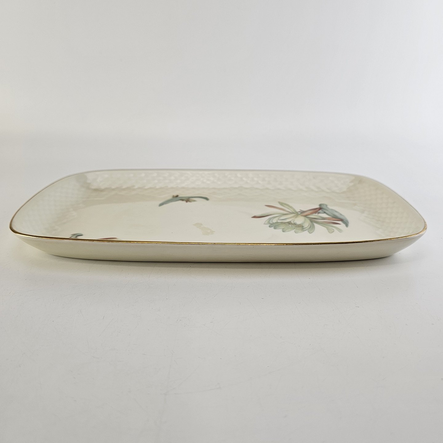 Kaktus er cremefarvet porcelæn i skælform, dekoreret med kaktusblomster og guldkant