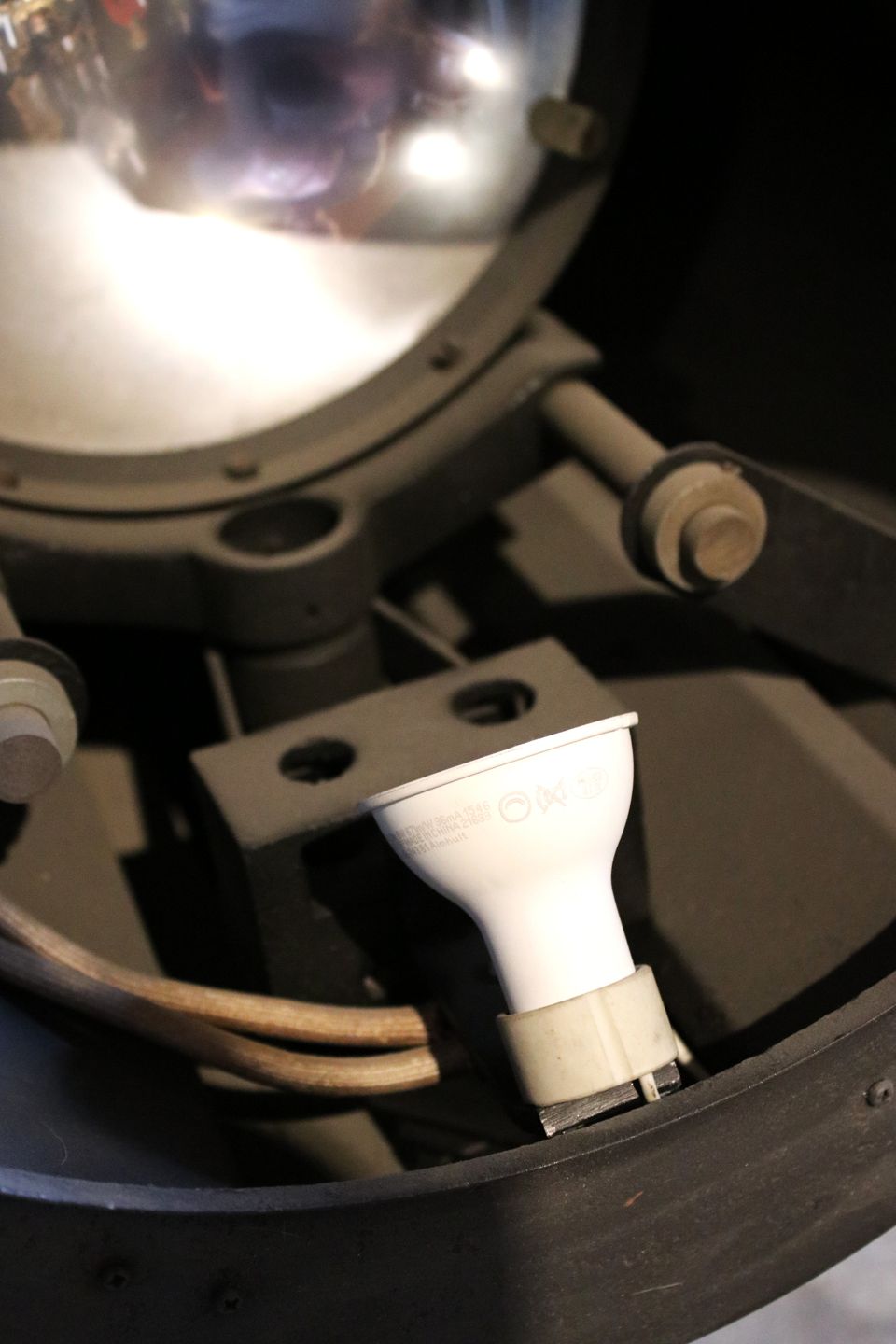 Den gamle Industri lyspære er udskiftet med halogenlampe og er monteret med ny stofledning.