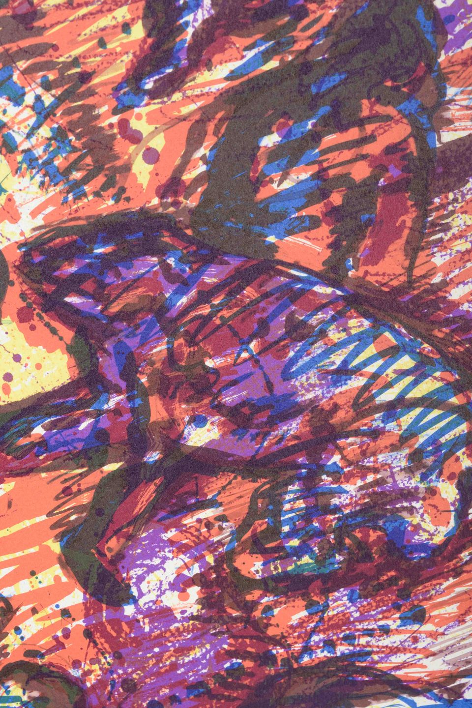 Et ekspressivt værk præget af kraftige penselstrøg og intense farver i rød, blå, lilla og brun, hvor organiske og figurative former flyder ind i hinanden. Kompositionen bærer præg af kunstnerens abstrakt-ekspressionistiske, koloristiske billedsprog med tydelig dynamik og bevægelse i motivet.
