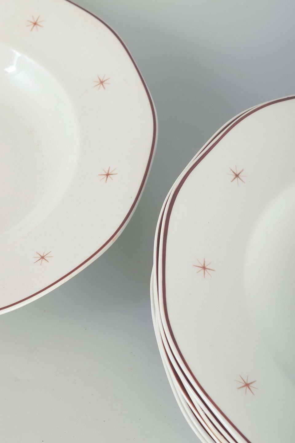 Art Deco-inspirerede suppetallerkener i hvidt porcelæn med dekoration i brune og gyldne toner, stjerneornamenter langs randen samt motiv af et hus og træer.