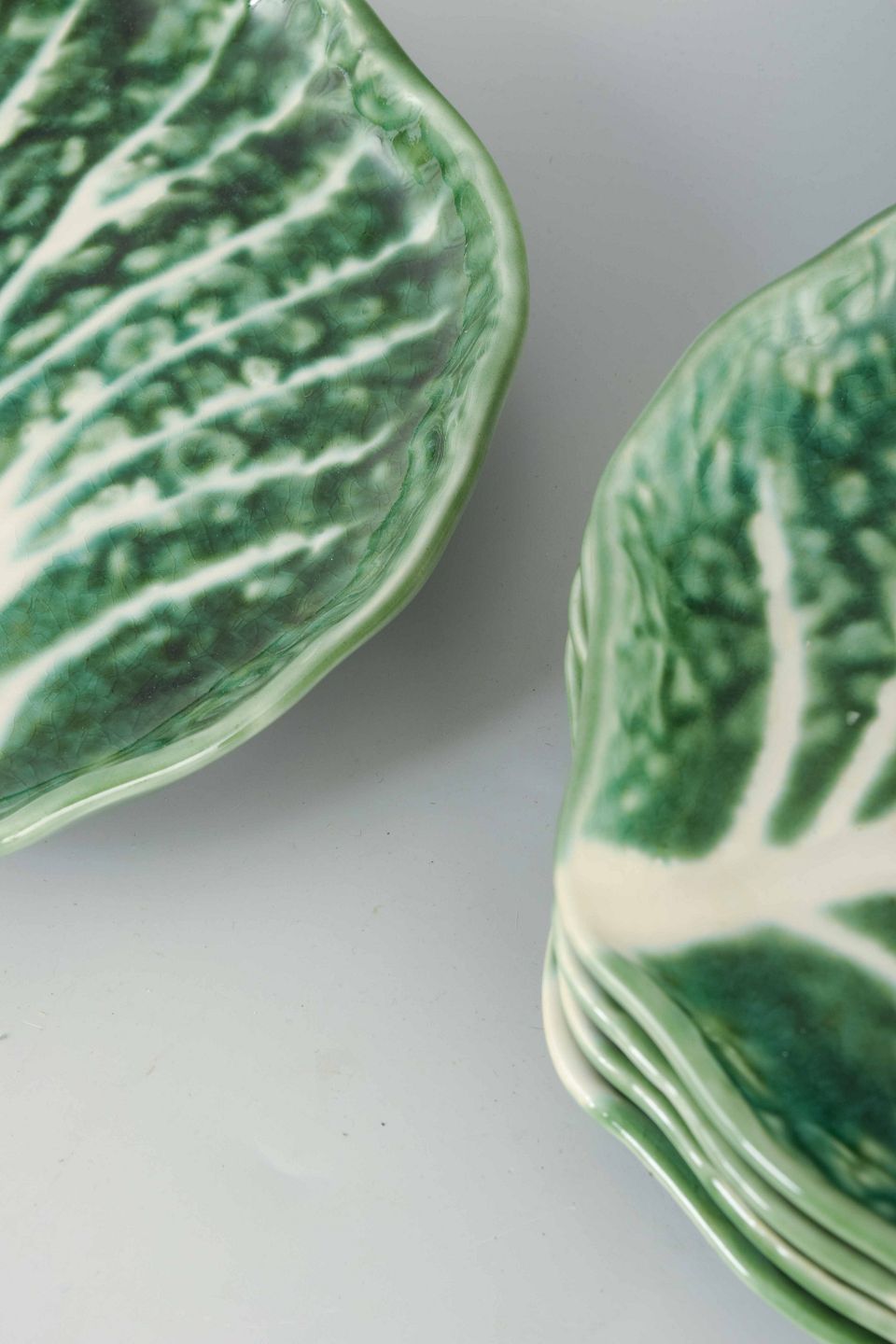 Organisk formede fajancetallerkener i majolika, udført som kålblade i grøn glasur.