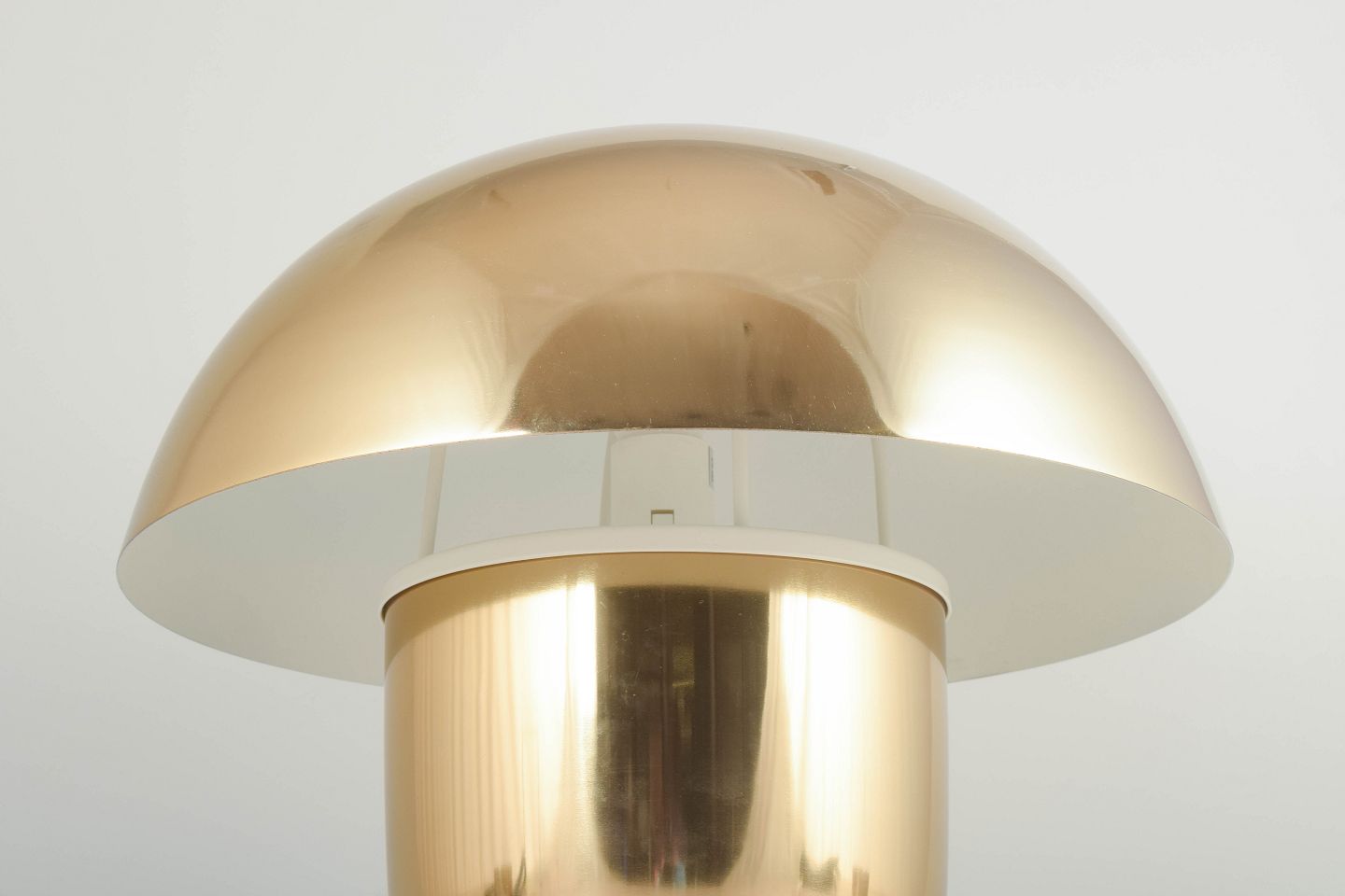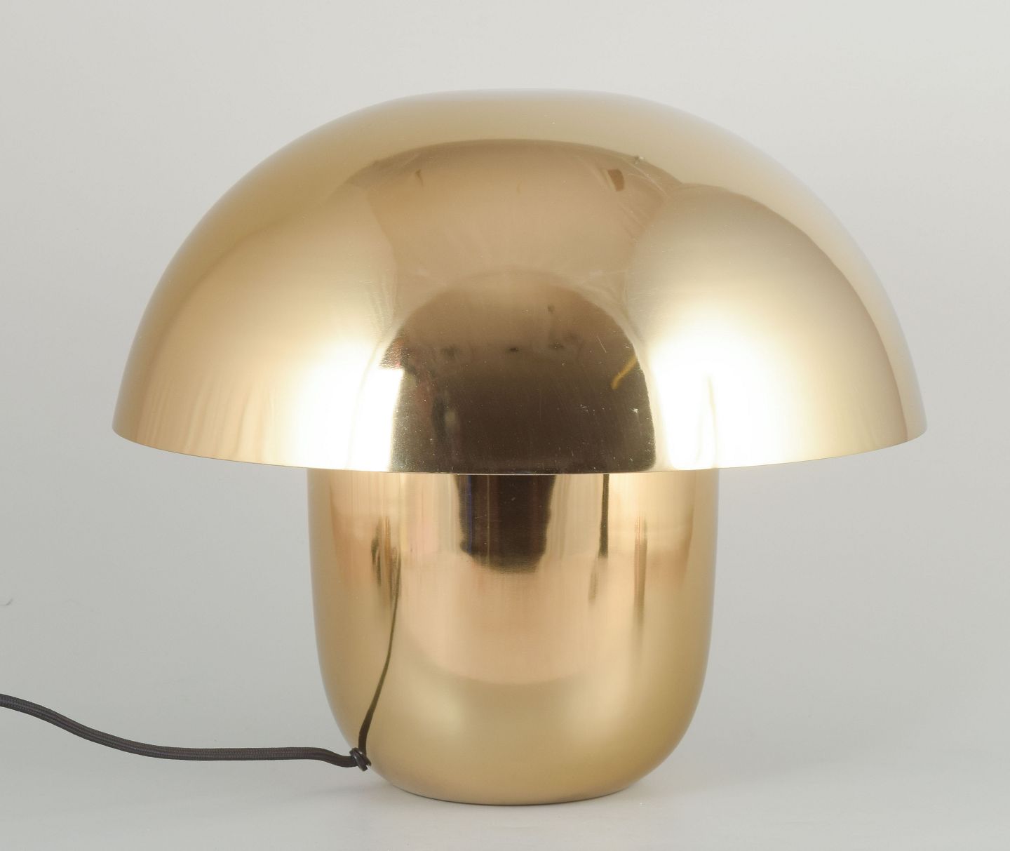Organisk formet bordlampe i poleret messinglook med svampeformet skærm.