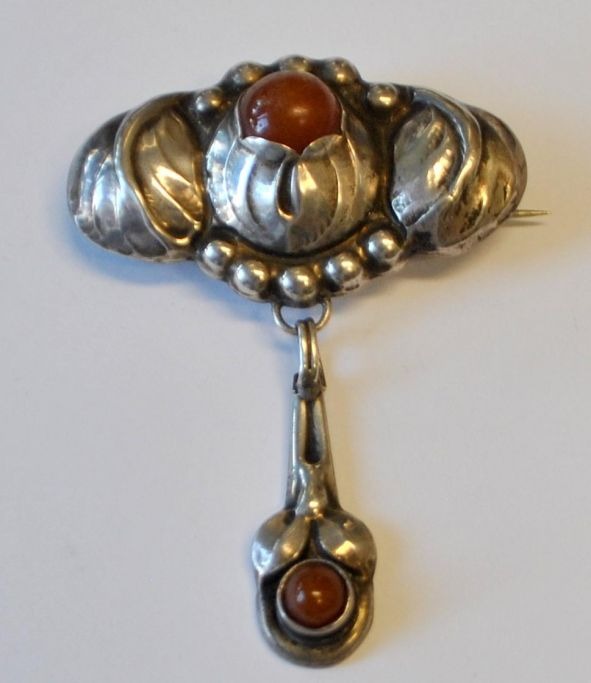 Dänische Jugendstilbrosche aus Silber mit Bernstein, 20. Jahrhundert. Hans Jensen & Co, Kopenhagen (nach 1928). Dekor in Form von Blattwerk. Gestempelt mit 830 und Meistermarken. B.: 5 cm. H.: 5 cm.Bestellnummer: 28325