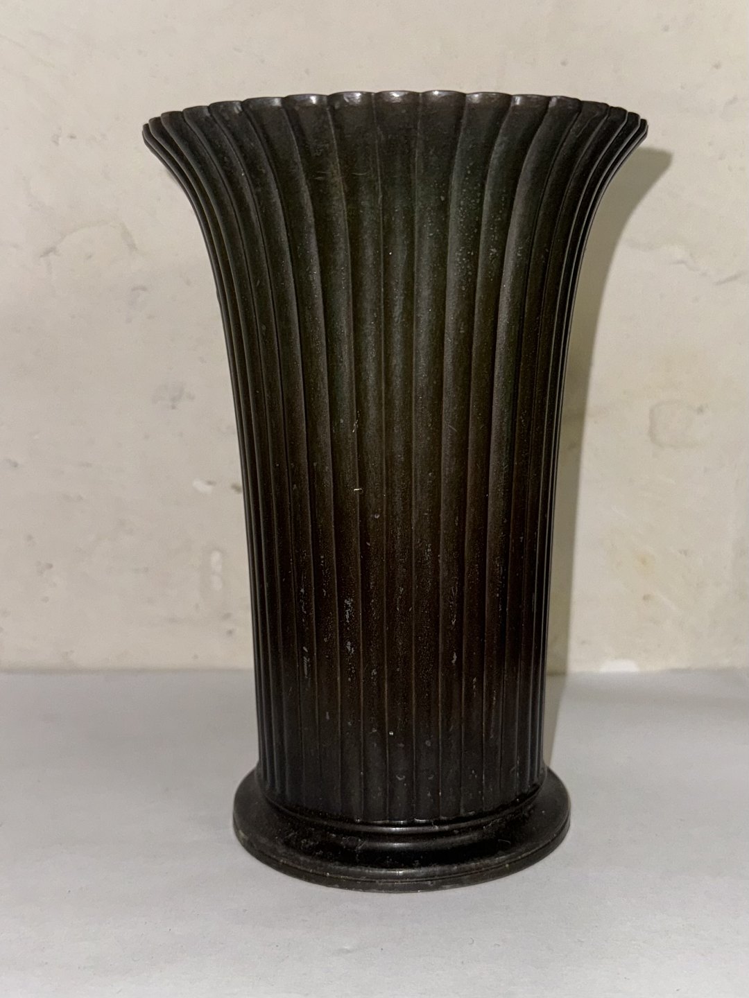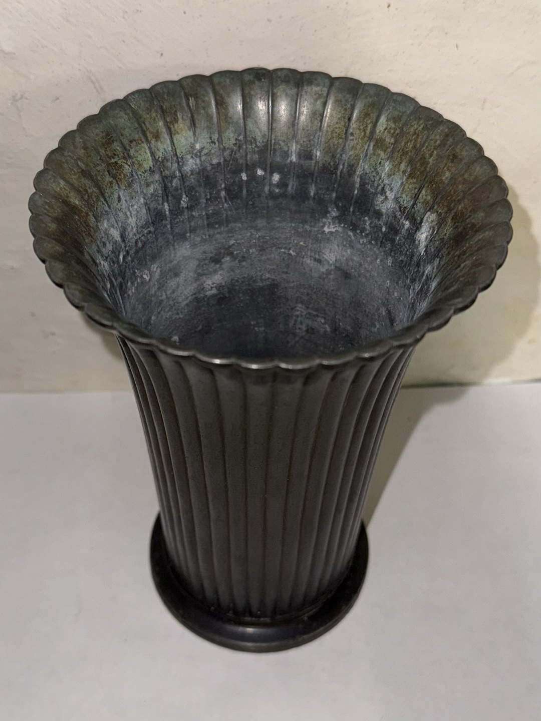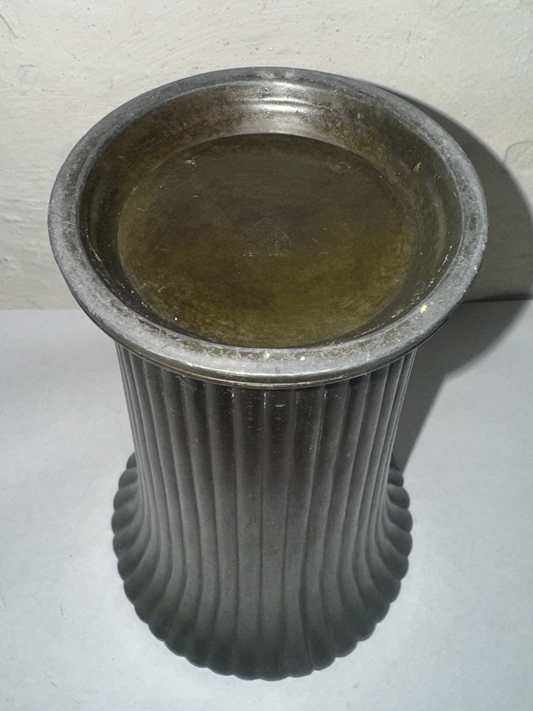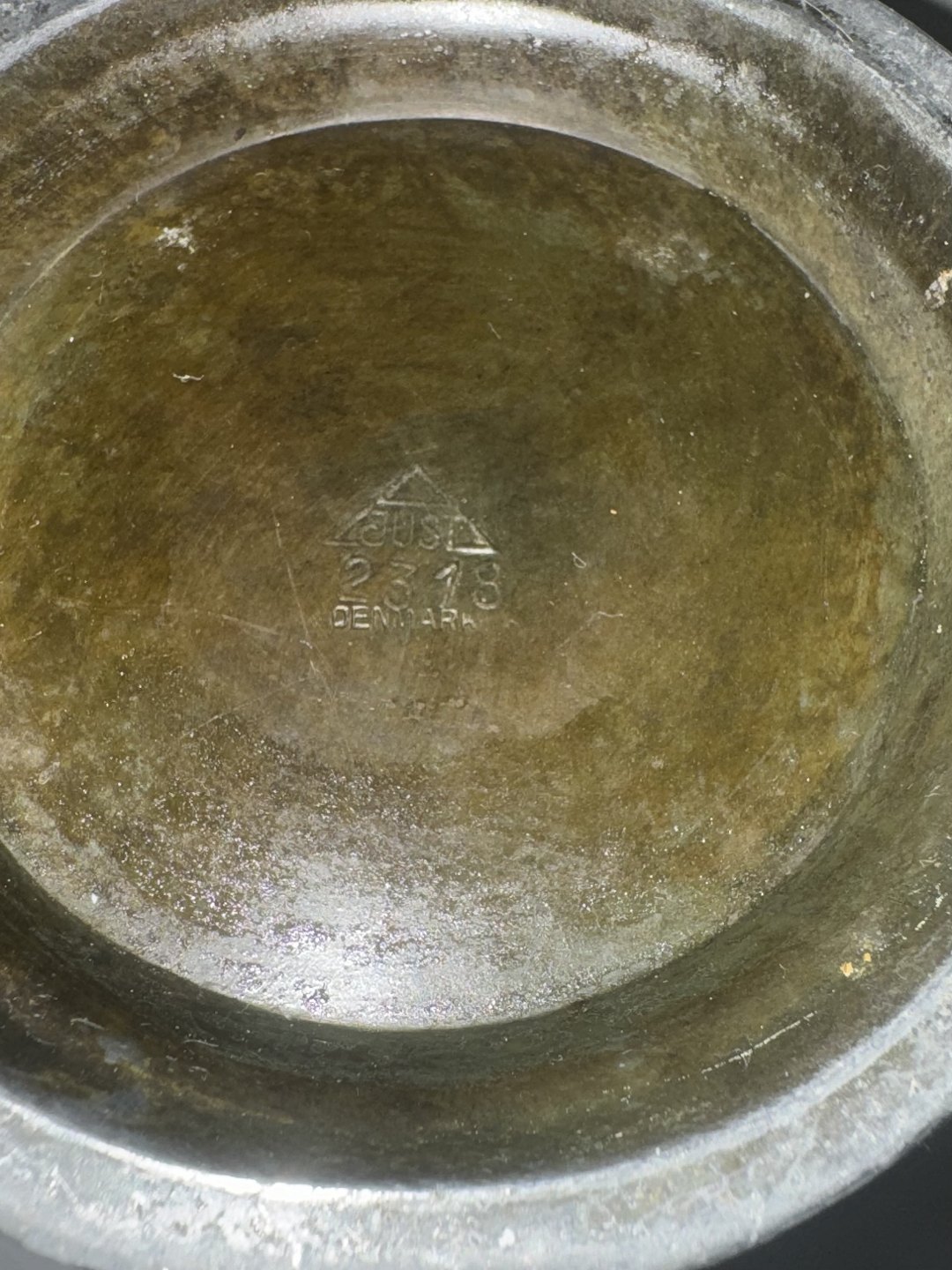 ART DECO STIL: Vase i diskometal fra Just Andersen’s værksted. Fremstillet i 1940’erne. Har været brugt som blomstervase, hvorfor der er overflade brugsspor indvendigt. Ellers intet at bemærke. Fabriksmærket på bunden med logo samt modelnummer 2318 samt DENMARK. Mål: H. 18 cm toppens diameter er 12,5 cm