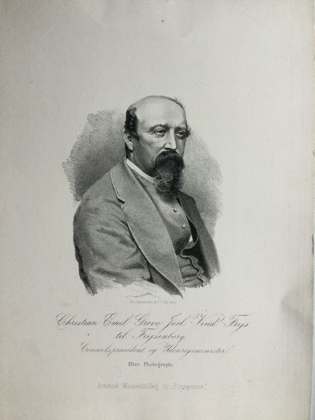 Litografi af Em. Bærentzen - Portræt af Statsminister, Lensgreve Christian Emil Krag-Juel-Vind-Frijs til Frijsenborg.