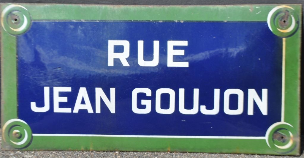 Originales Emailleschild aus der Rue Jean Goujon, Paris, um 1900. Frankreich. In den Farben Blau, Grün und Weiß. 70 x 35 cm.Sehr schöner Zustand!