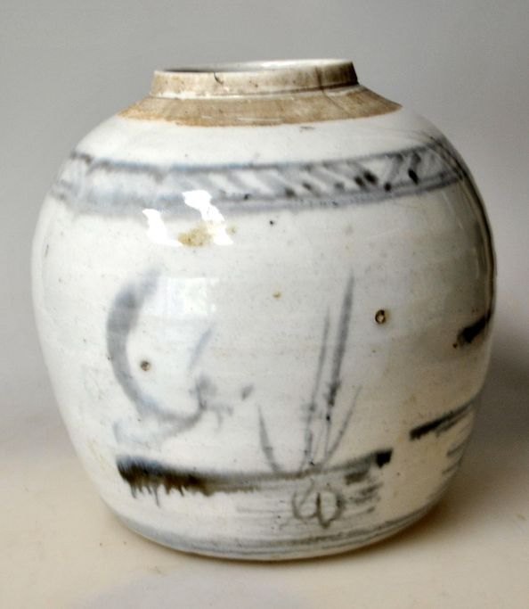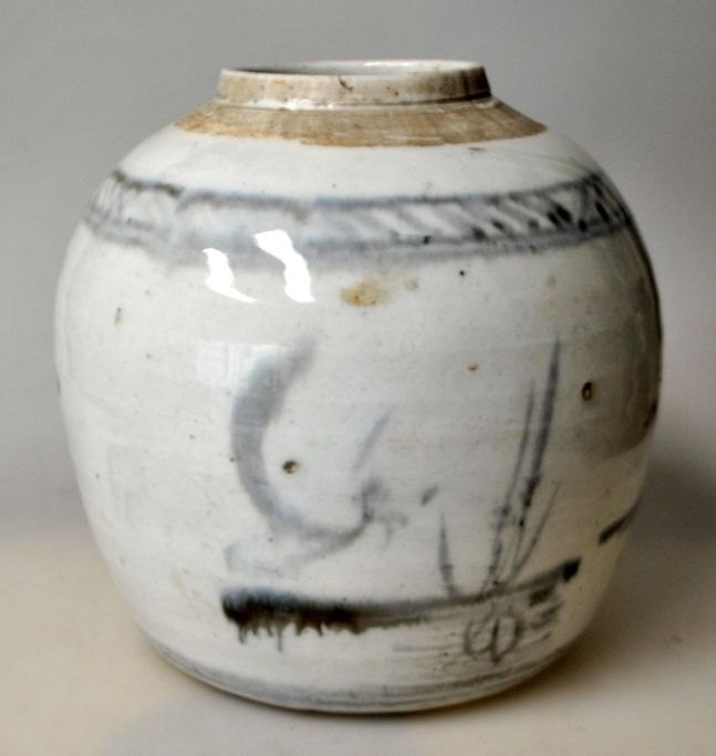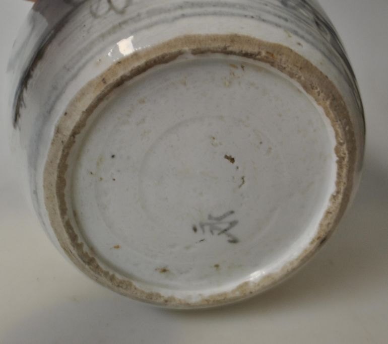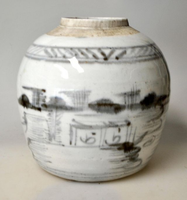 Chinesischer Bojan, 19. Jahrhundert. Graues Porzellan mit blaugrauer Bemalung. Landschaftsdekor. Ohne Deckel. Gestempelt. H.: 15,5 cm. Durchmesser: 15,5 cm.NB: Kleiner Haarriss am Rand.