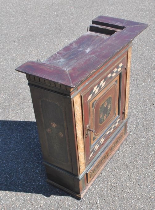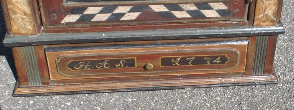 Dänischer bemalter Louis XVI-Hängeschrank, 1774. Mit Zahnschnitt oben und Säulen an den Seiten. Mit einer Schublade. Bemalt mit einem Schachbrettmuster und einer Blumenranke in der Mitte der Tür. Innen mit einem grün bemalten Regal. Mit den Initialen: HAS und 1774 auf der Vorderseite der Schublade. H.: 75 cm. B.: 70 cm. T.: 30 cm.