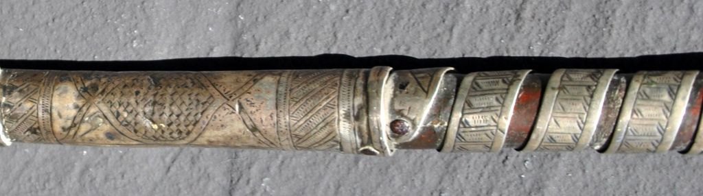 Antike türkische Reitpeitsche. 19. Jahrhundert. Mit silbernem Griff. Mit zahlreichen Windungen aus Silber. Alles verziert. Grifflänge: 46 cm. Gesamtlänge: 77 cm.Bestellnummer: 28115