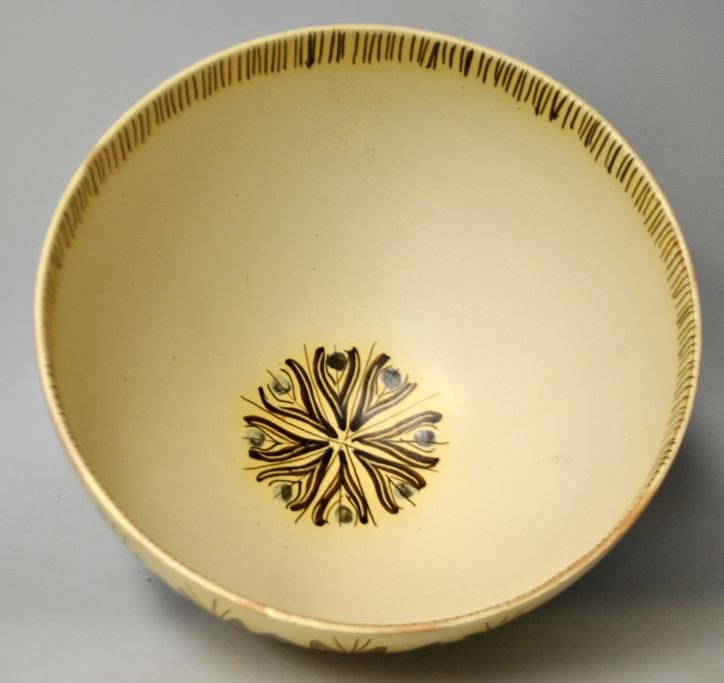 Krøyer, Ady (1933 - 2016) Dänemark: Keramische Tischschale. Roter Ton mit gelber, grüner und brauner Glasur. Außen mit einem Blattmuster verziert. Auf der Unterseite - vermutlich ein Samendekor. Innenseiten mit einem Linienmuster verziert. Signiert: Ady, Dänemark. H.: 16 cm. Durchmesser: 24,5 cm.NB: Kleinere Beschädigung an der Ständerkante.