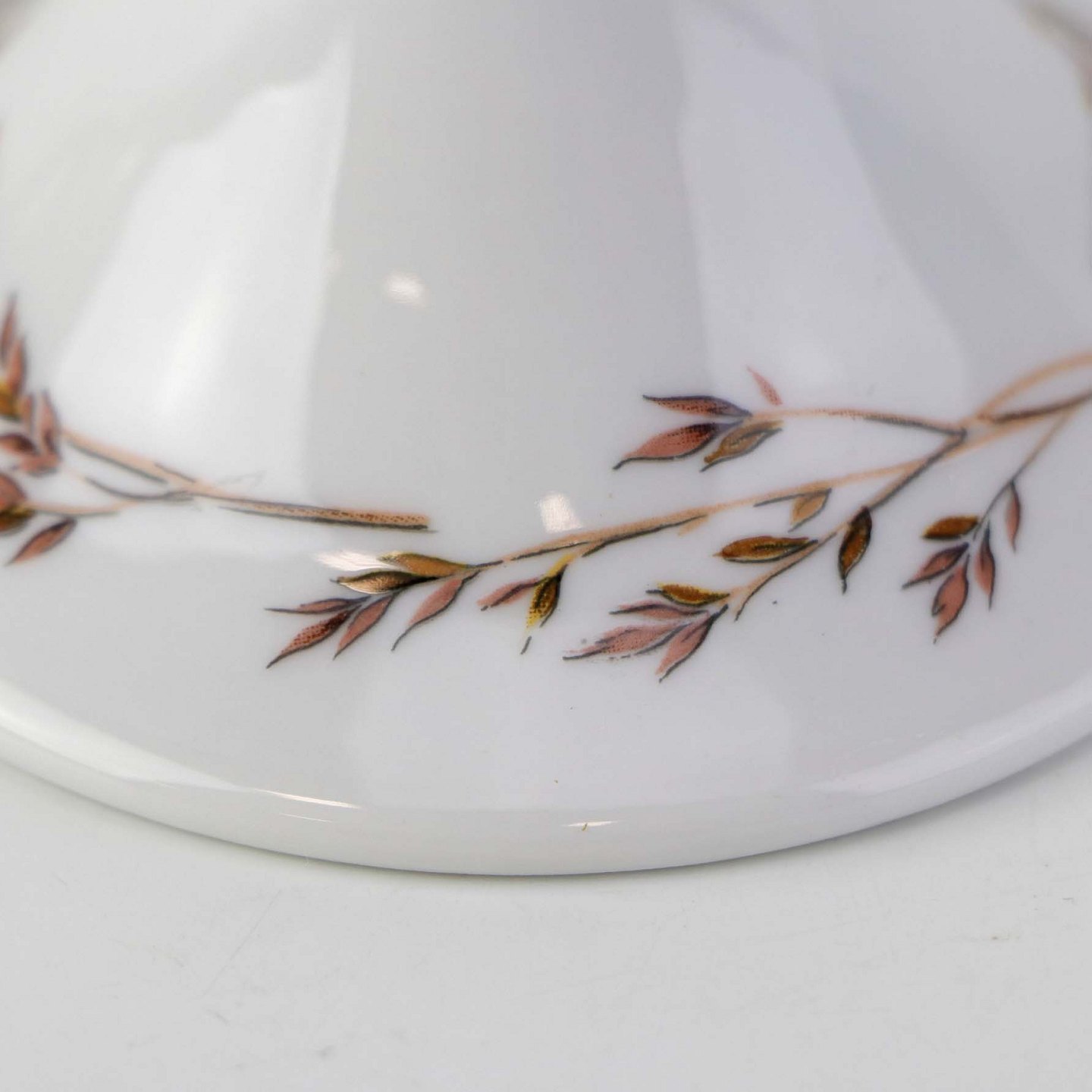 Jagtstellet er i glat hvidt porcelæn med gyldenbrun kantdekoration og motiver af forskellige vilde danske dyr i deres naturlige miljø. Stellet er holdt i dæmpede varme efterårsfarver.