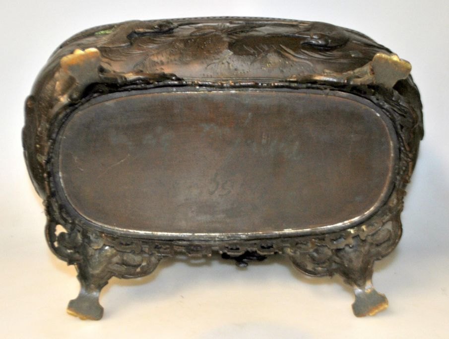 Große chinesische Blumenjardiniere aus Bronze, 19. Jahrhundert. Auf vier Löwenfüßen. Mit Randverzierungen. Seiten mit großem Drachen und Vögeln verziert. L.: 32 cm. B.: 19 cm. H.: 18 cm.Perfekter Zustand!