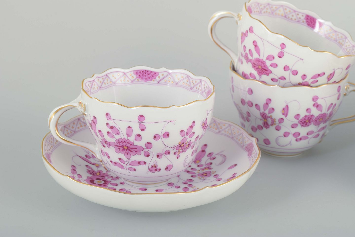 Meissen, Europas første porcelænsfabrik grundlagt i 1710, blev hurtigt berømt for sine udsøgte håndmalede dekorationer og høje kvalitet. "Indian" mønsteret, introduceret i 1740’erne og inspireret af asiatisk porcelæn, er et af manufakturens mest klassiske designs. Den rosa variation, "Pink Indian", er særlig eftertragtet for sit elegante udtryk og udgør en tidløs tilføjelse til ethvert teselskab.